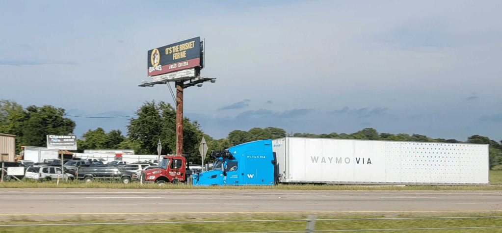 Ein autonomer Waymo Via LKW wurde gesichtet, als er neben dem Highway 45 südlich von Dallas auf dem Grasstreifen stand.