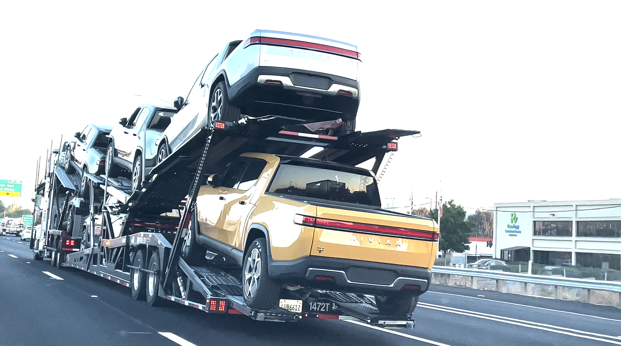 Dieser Autotransporter mit 6 Rivian R1T Pickups wurde am 16. August 2022 um 7 Uhr morgens auf dem Highway 101 in Richtung Norden gesichtet.