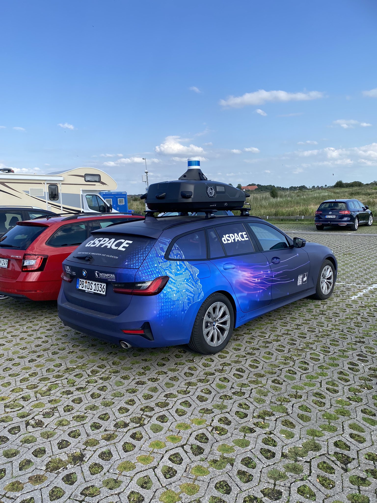 Ein mit LiDARs und Kameras ausgestattetes Fahrzeug der in Paderborn beheimateten Automotivesoftwarefirma dSpace wurde gesichtet. Als Sensoraufbau wurde ein Dachgepäckträger umgebaut.