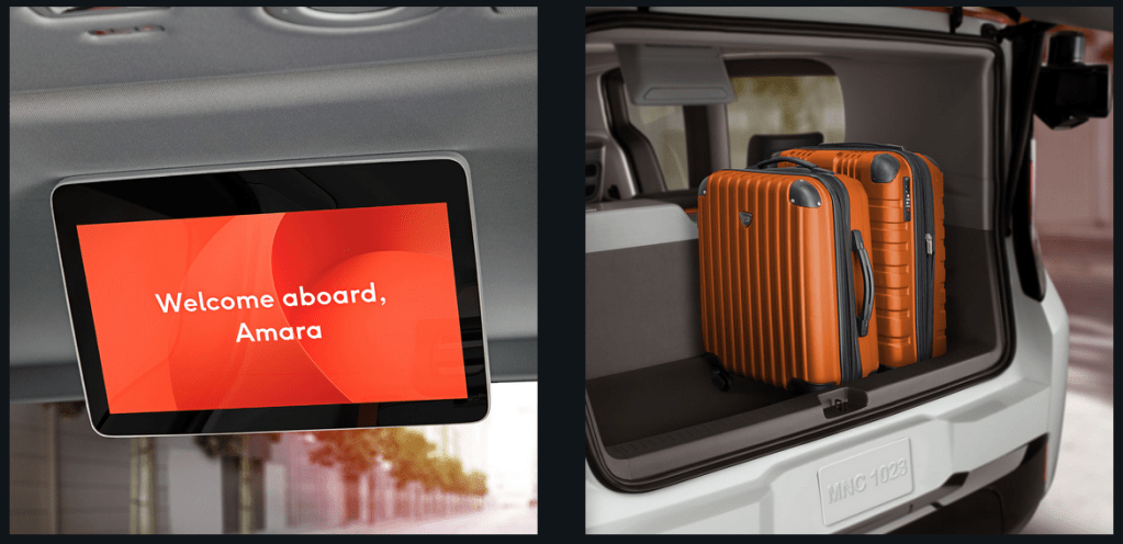 Der Fahrgastraum befindet sich auf der Rückbank, der Fahrer- und Beifahrersitz sind für die App-Benutzer nicht zugänglich. Auch ist der Fahrgastraum von den vorderen Plätzen durch eine Plexiglaswand abgetrennt, sodass Fahrgäste nicht in die Lenkeinrichtung eingreifen können. Insgesamt sieht man drei Bildschirme im Fahrzeug, eines vorne, eines auf den Rückseiten der Vordersitze angebracht, auf denen die Fahrstrecke angezeigt werden. Dort können auch Radiosender ausgewählt, Trivia-Fragen beantwortet und Klimaanlage kontrolliert werden.