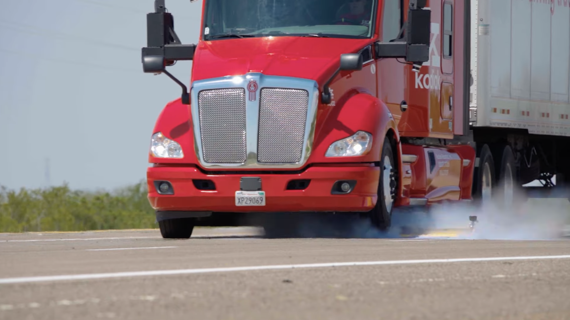 Das in Palo Alto beheimatete Startup Kodiak entwickelt selbstfahrende LKWs und demonstrierte, wie das Fahrzeug mit einem Reifenplatzer umgeht. Diese sind ein immer wieder vorkommendes Ereignis, das besonders beim Platzen der Reifen auf der Lenkachse von den Fahrern nur mit Mühe zu kontrollieren sind.