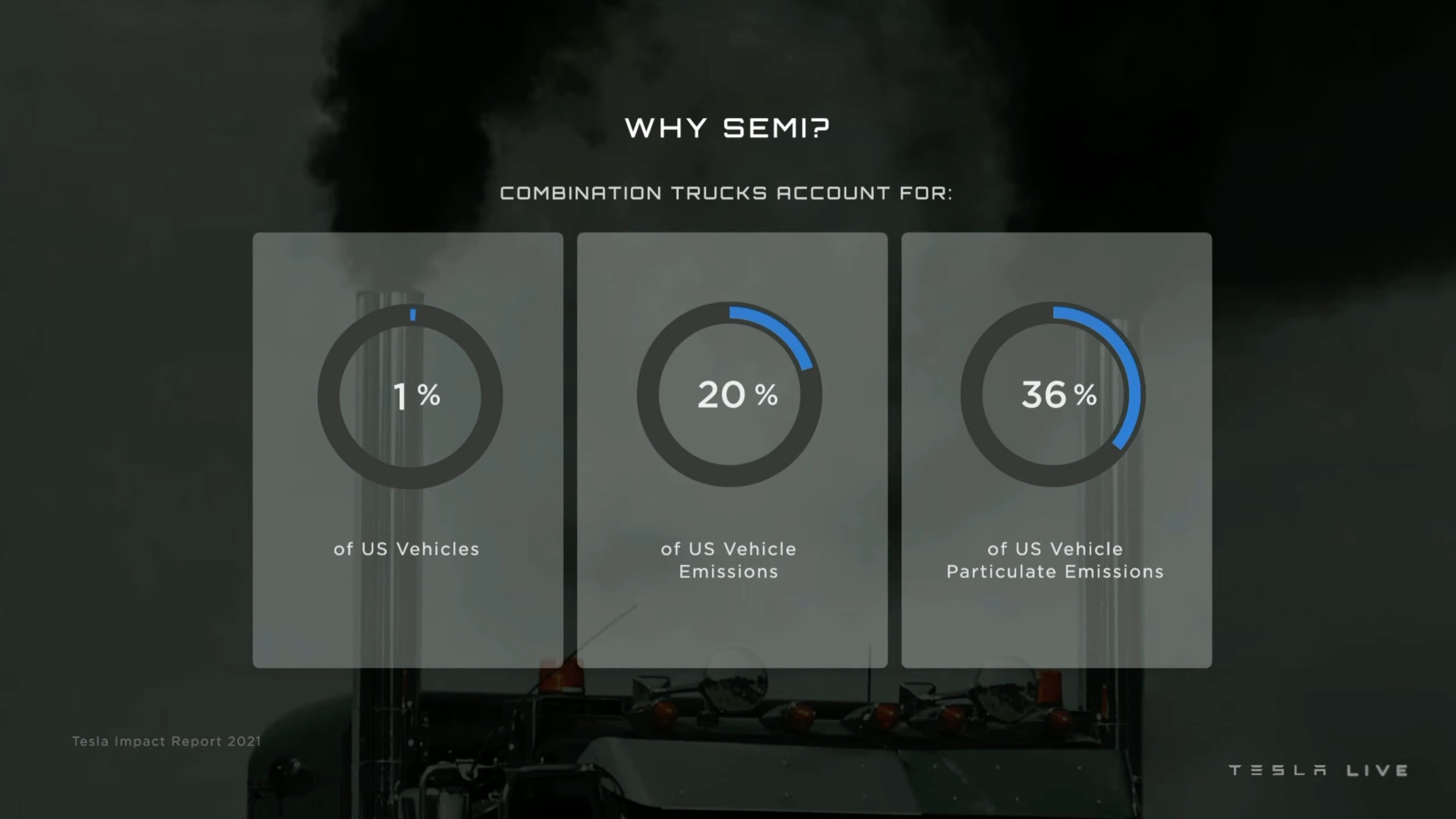 Tesla-CEO Elon Musk ging auch auf die Motivation ein, einen batterielektrischen Sattelschlepper zu bauen. In den USA repräsentieren LKWs gerade mal 1% aller Fahrzeuge, sie sind aber 20% der Fahrzeugemissionen und sogar 36% der Feinstaubemissionen verantwortlich.