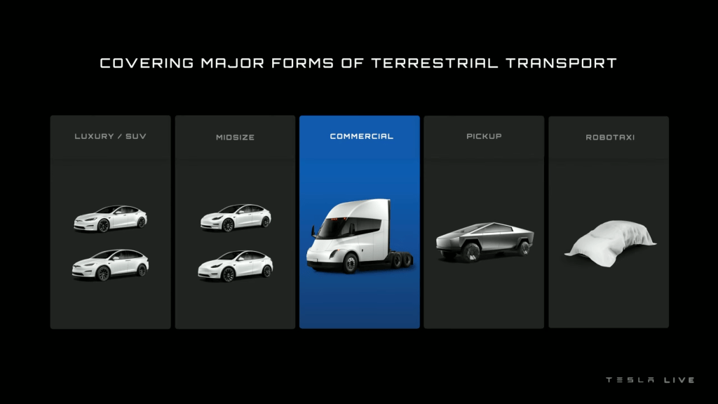 In der Präsentation sprach Musk auch über die Unternehmensmission von Tesla, die entlang von Limousinen, SUVs, Pickups und nun den Tesla-Sattelschlepper auch ein Robotaxi andeutete. Dieses war auf der Folie allerdings noch verhüllt.