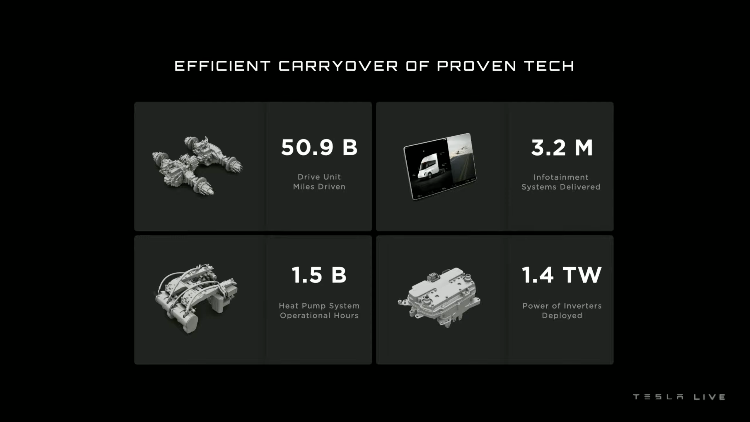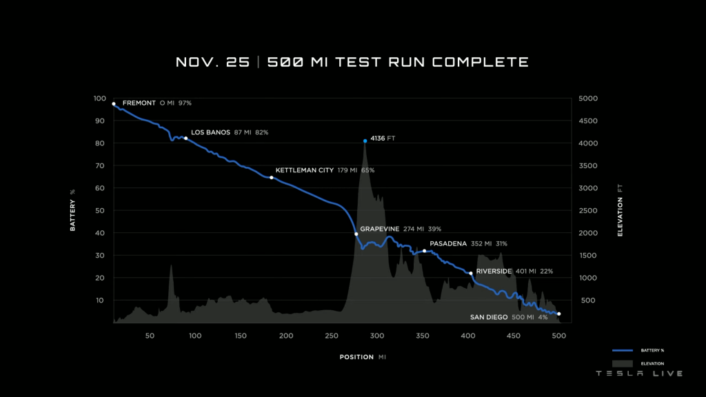 Auch wurde die problemlos mit voller Beladung und ohne Ladezwischenstopp durchgeführte, 800 Kilometer (500 Miles) lange und etwa acht Stunden dauernde Fahrt von Fremont nach San Diego vom 25. November 2022 gezeigt, die alle Sorgen um Reichweite beseitigen sollten. Dabei waren auch mehrere Pässe und Steigungen zu überwinden.