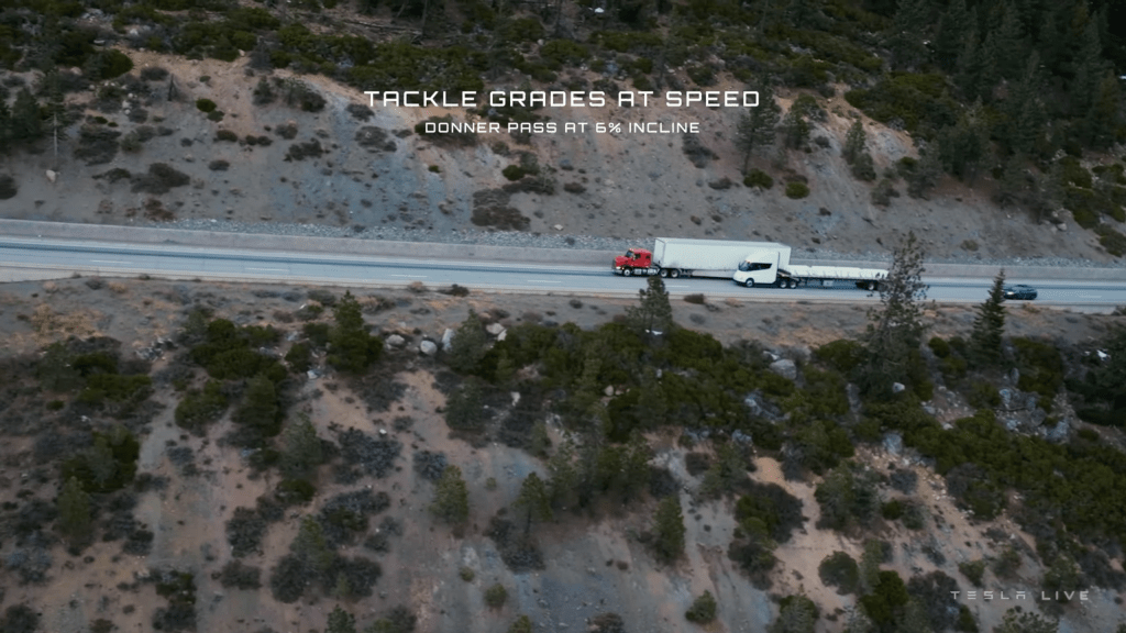 In einem Video wurde auch gezeigt, wie ein mit 36,2874 Kilogramm (80.000 Pfund) vollbeladener Semi Truck den Donnerpass auf der I-80 bei Lake Tahoe mit einer sechsprozentigen Steigung hochfährt und die langsam dahinschnaufenden Diesel-Sattelschlepper hinter sich lässt. Auch beim Runterfahren von Pässen wird die Energie wieder rekuperiert, wie bei jedem anderen Elektroauto auch.