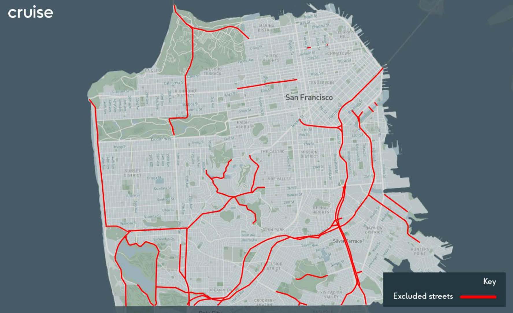 Cruise-CEO Kyle Vogt kündigte am Donnerstag die genehmigte Erweiterung durch die kalifornische Verkehrsbehörde DMV an, mit der Cruise Robotaxis nun die gesamte Stadt San Francisco – mit Ausnahme von Highways mit hoher Geschwindigkeit – abdecken dürfen, und das zu jeder Tages- und Nachtzeit, sieben Tage die Woche. Allerdings benötigt Cruise noch eine weitere Genehmigung von der CPUC, die für Taxiregulierungen zuständig ist, damit auch im gesamten Bereich Fuhrlohn verlangt werden kann.