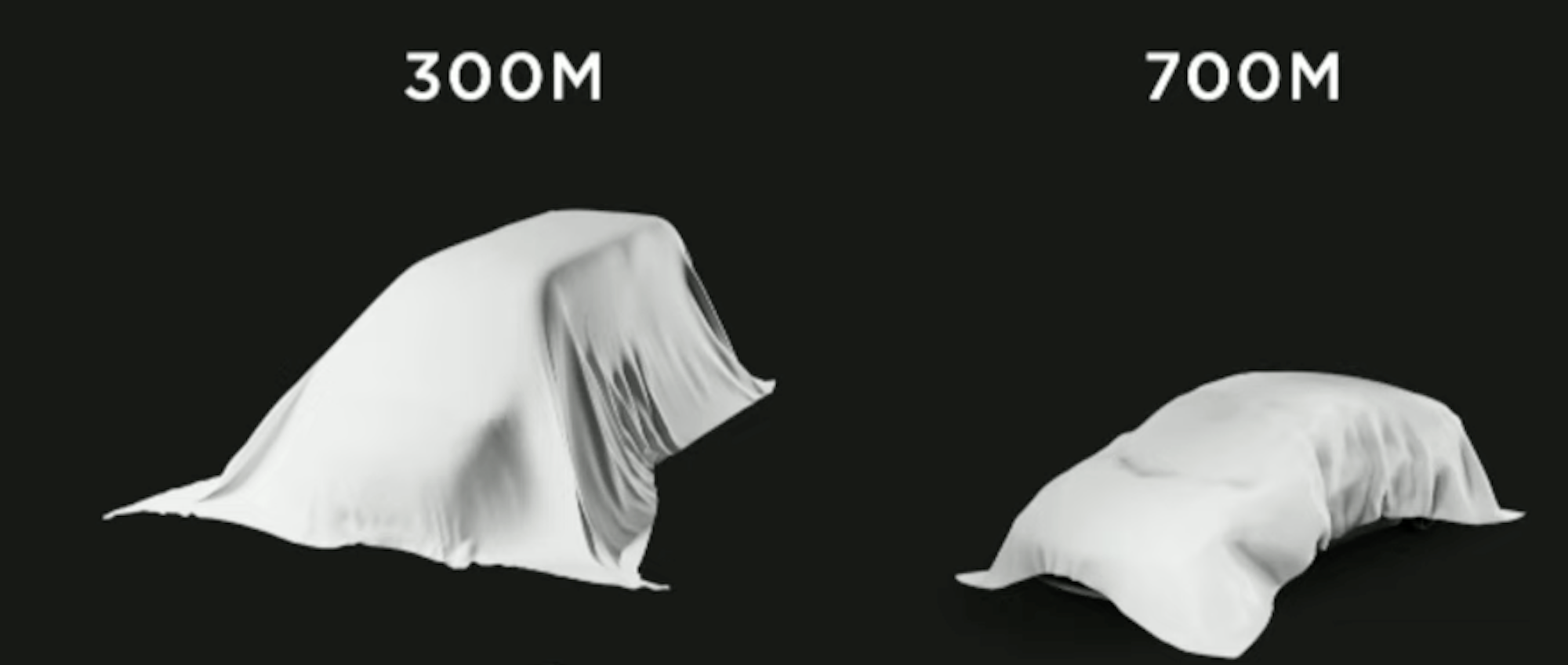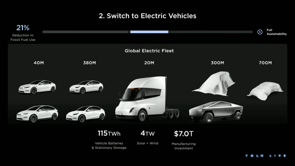 Dabei ist das ganz rechte Fahrzeug mit 700 Millionen beziffert, das linke mit 300 Millionen Stück. Im Vergleich dazu beziffert Tesla das Potenzial bei Model S/X mit gemeinsamen 40 Millionen Stück, beim Model 3/Y bit 380 Millionen. Beim rechten verhüllten Fahrzeug handelt es sich um das ominöse „Next Gen Vehicle“, das vermutlich ein Fahrzeug mit einem Preis um 25.000 Dollar sein wird. Dazu wird es aber noch einen separaten Vorstellungstermin geben, wie Chefdesigner Franz von Holzhausen ankündigte.