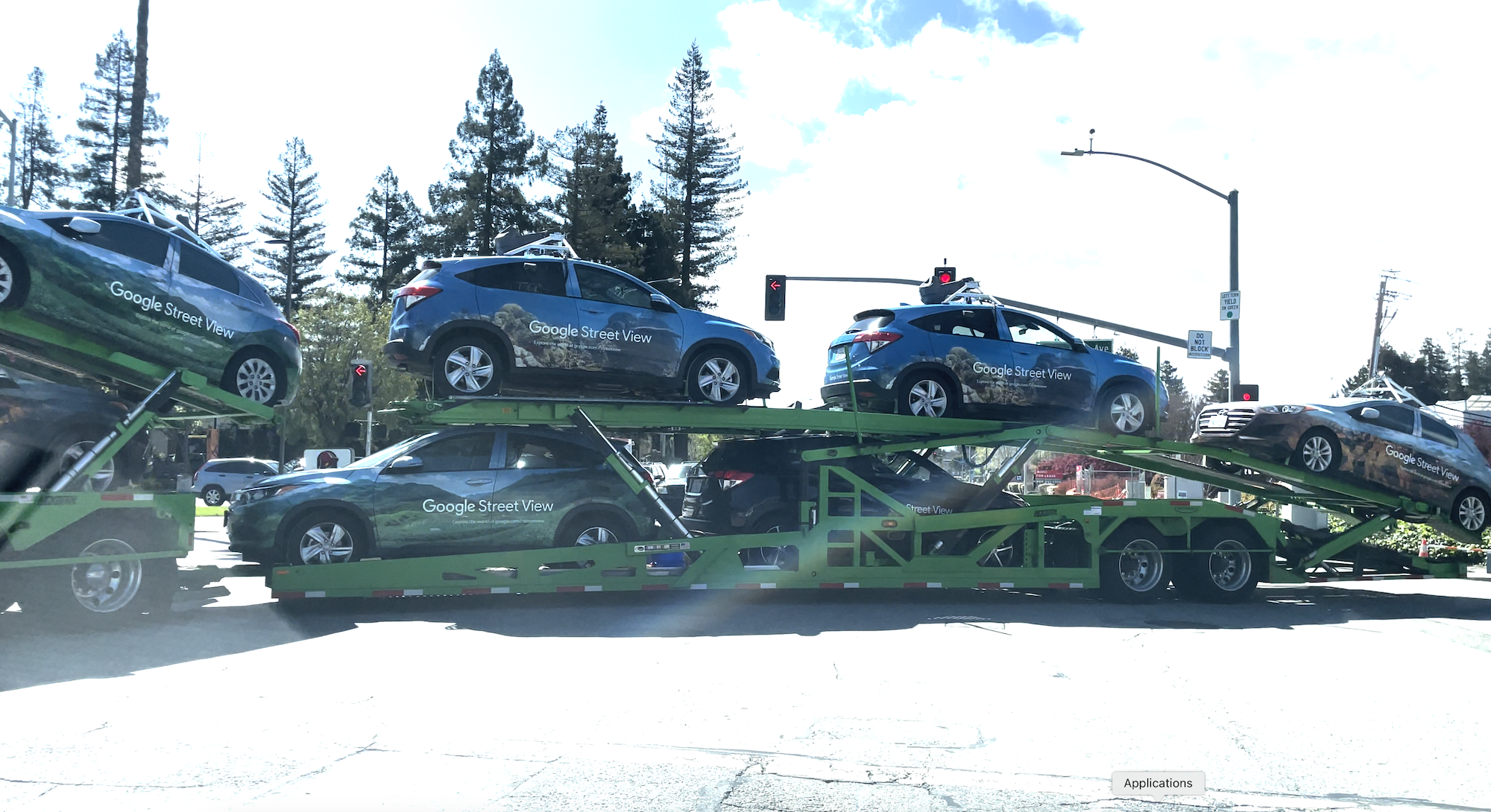 Dieser Autotransporter mit Google Street View-Autos wurde am Freitag, 31. März 2023, gegen 11:20 Uhr gesichtet. Der Standort war die Kreuzung Shoreline Blvd und Terra Bella Ave in Mountain View.