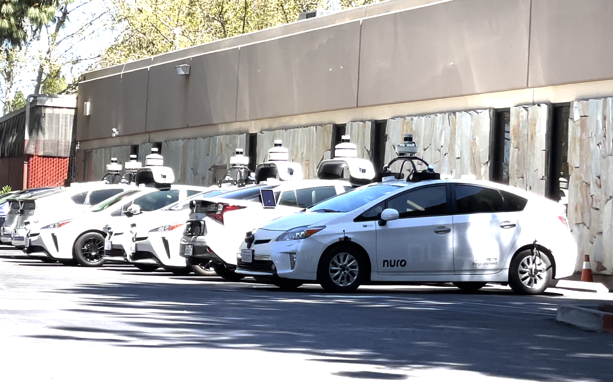 Diese Mischung aus Nuro-Testfahrzeugen mit alten und neuen Sensorgestellen wurde am 13. April 2023 gegen 14 Uhr auf dem El Camino Real in Mountain View gesichtet. Die neuen Sensoraufbauten, die auch an den Auslieferungsrobotern zu sehen sind, werden seit einigen Monaten an den Toyota Prius-Testfahrzeugen getestet.
