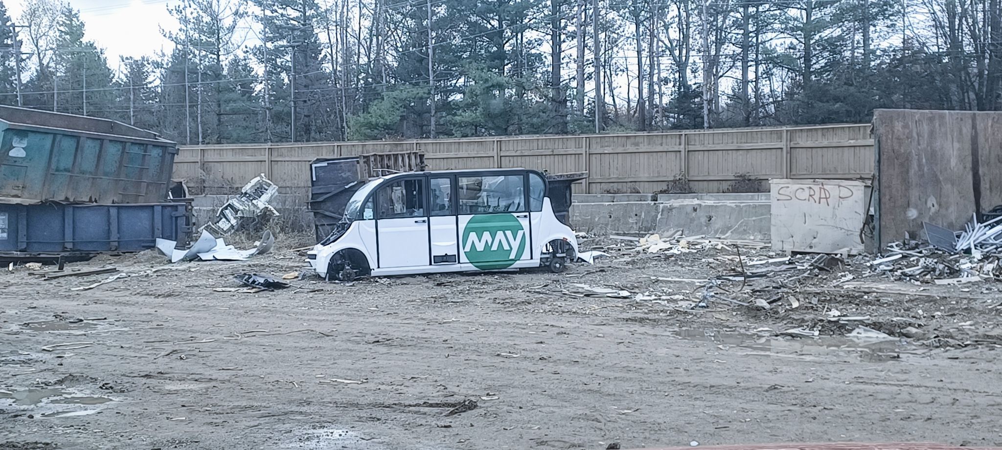 Kommen Robotaxis in den Himmel? Ich kann’s nicht für alle mit Bestimmtheit sagen, aber eines endete am Schrottplatz. Dieses Polaris GEM Elektroauto, das mehr wie ein verlängertes Golfwägelchen aussieht, und unter anderem von May Mobility als erste Plattform für die Entwicklung von Selbstfahrtechnologie verwendet wurde, wurde vom Systemanalysten Eric Paul Dennis auf einem Schrottplatz in Ann Arbor gesichtet. Und zwar völlig unglamourös, ohne Räder und ausgeschlachtet, dafür aber deutlich sichtbaren May Mobility-Logo.