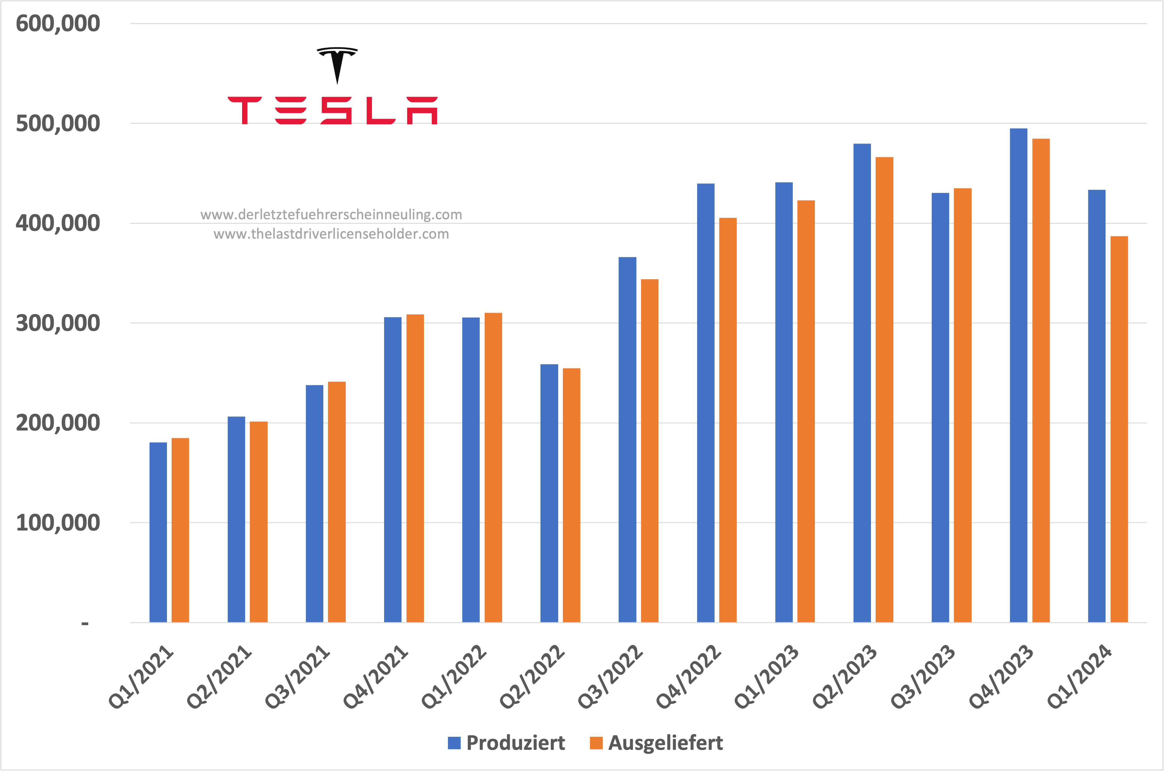 Diese Woche dominiert Tesla wieder einmal die Schlagzeilen, zumindest in der Automobilweltblase. Zuerst enttäuschten die Auslieferungszahlen in ersten Quartal 2024, die mit 386.810 Stück um 9 Prozent unter denen vom selben Vorjahresquartal lagen, und die Produktion, die mit 433.371 um 2 Prozent unter denen vom selben Vorjahresquartal lagen.