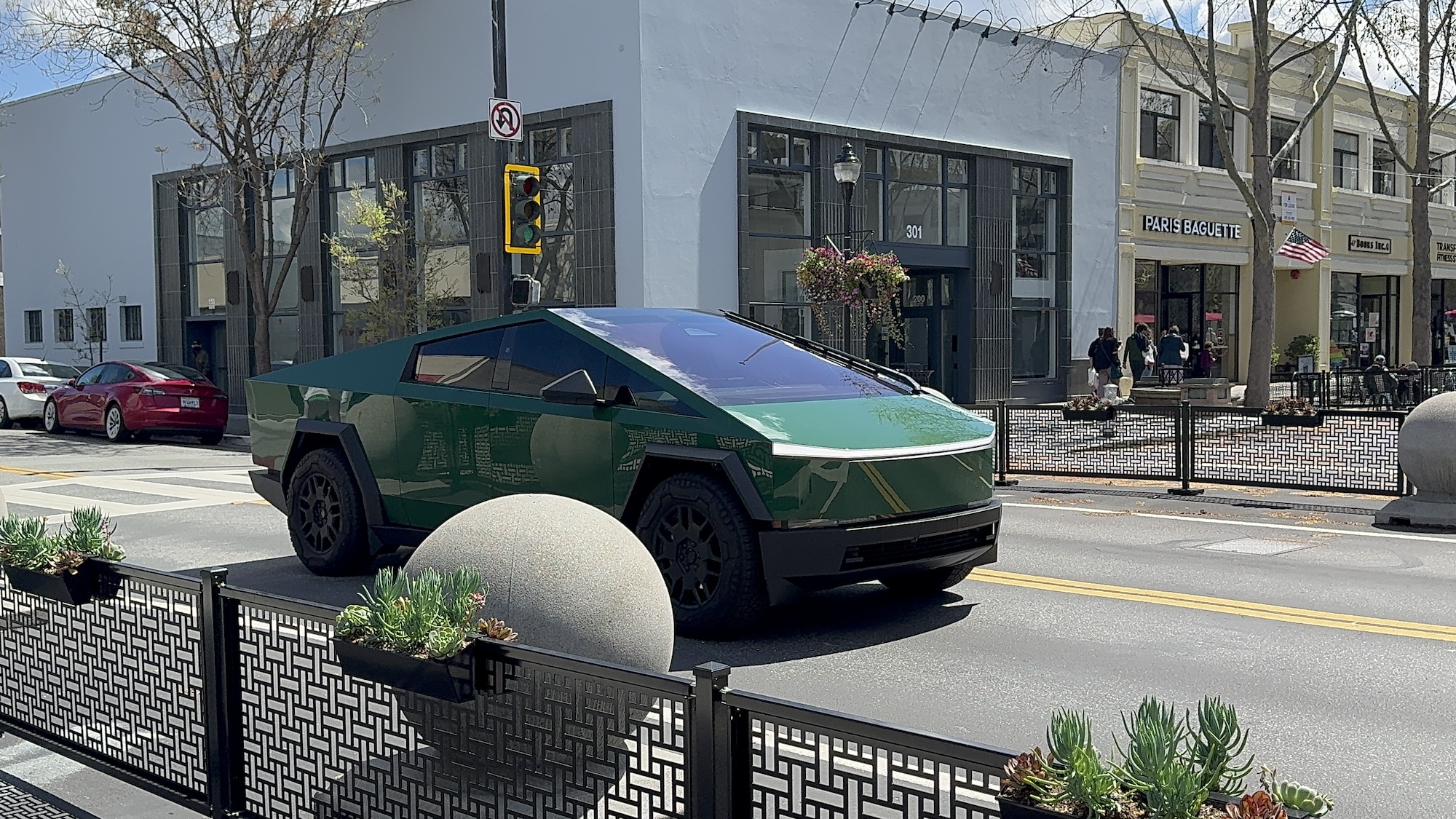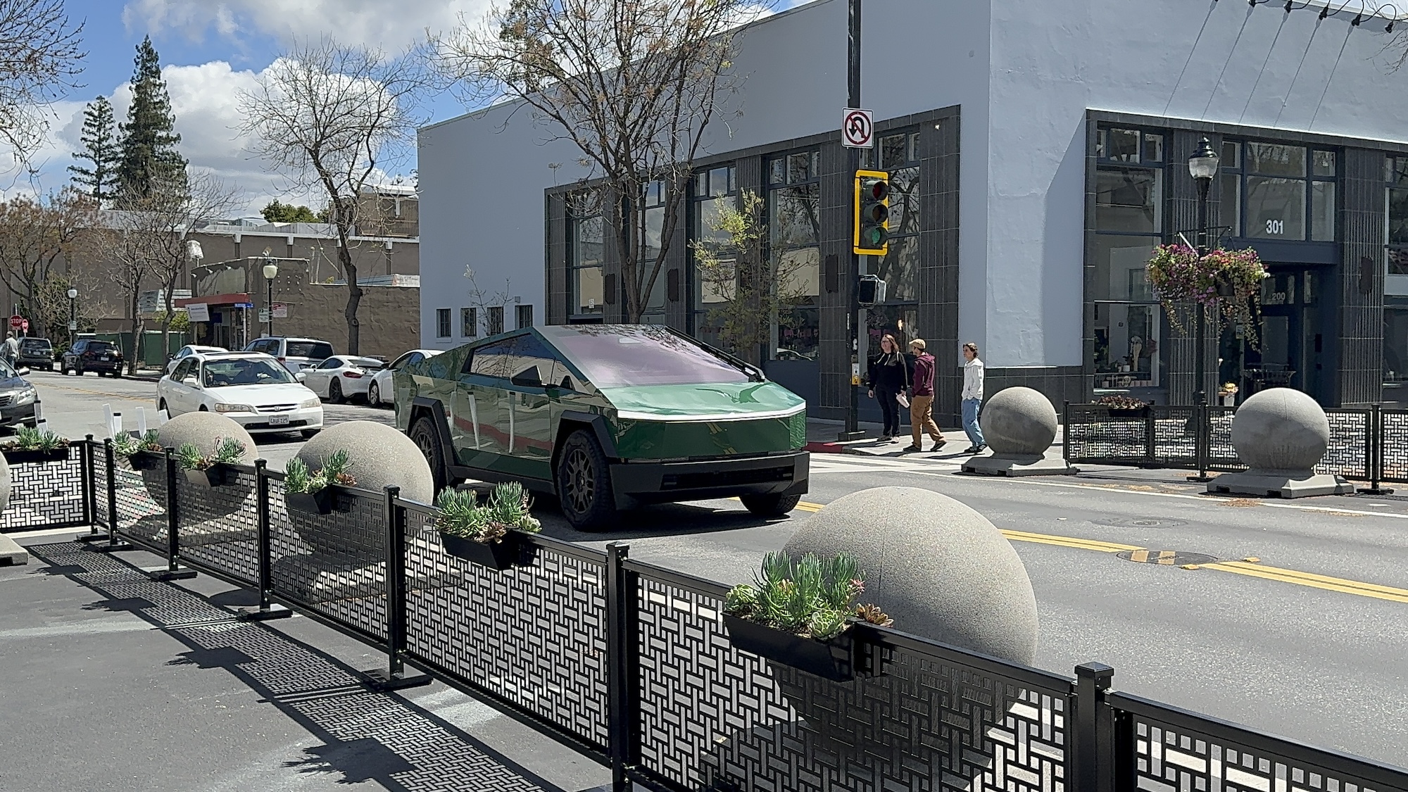 Dieser grüne Cybertruck wurde in Mountain View an der Kreuzung W. Dana Street und Castro Street am 14. April 2024 gegen 14:15 Uhr PST gesichtet.