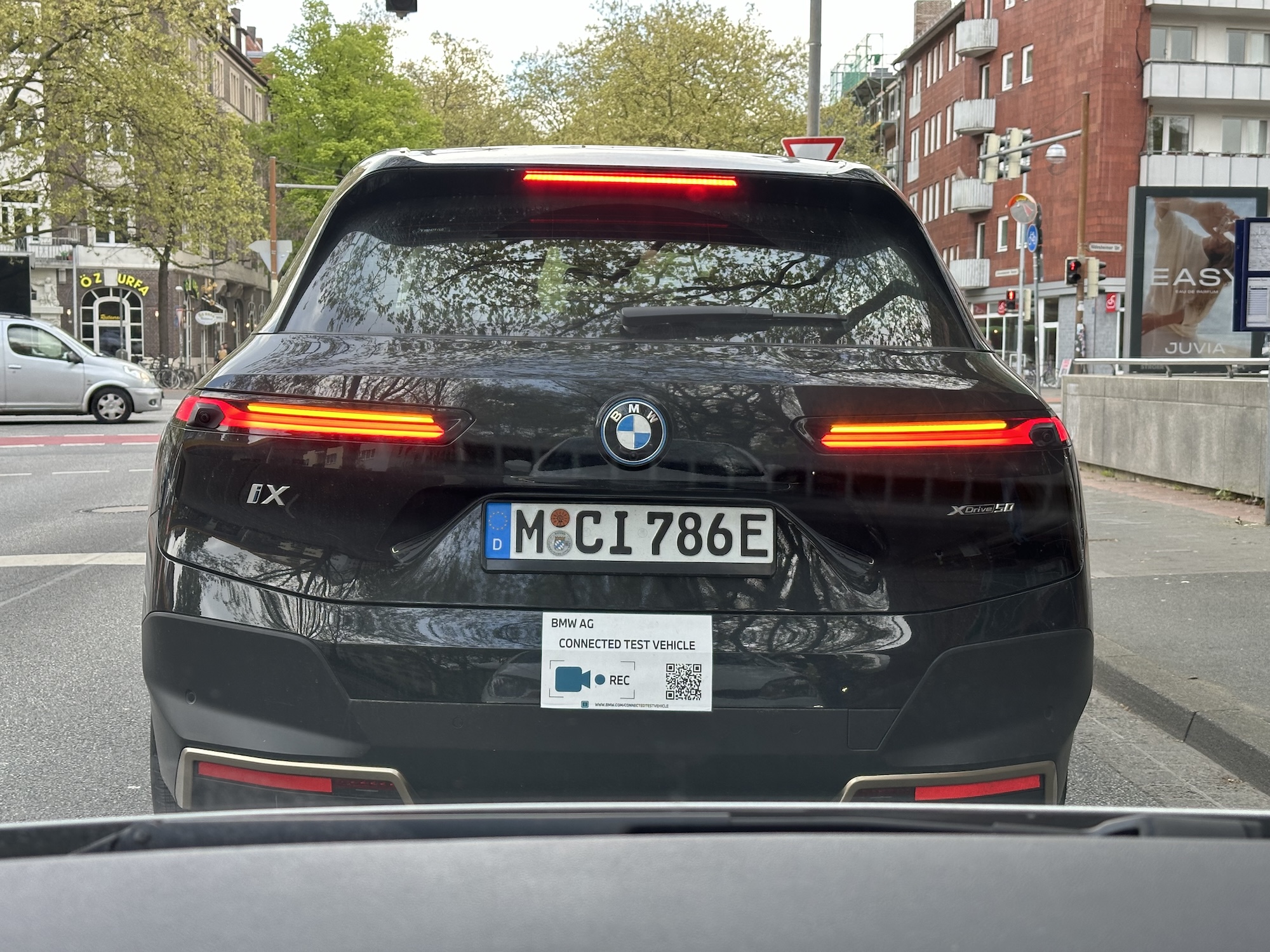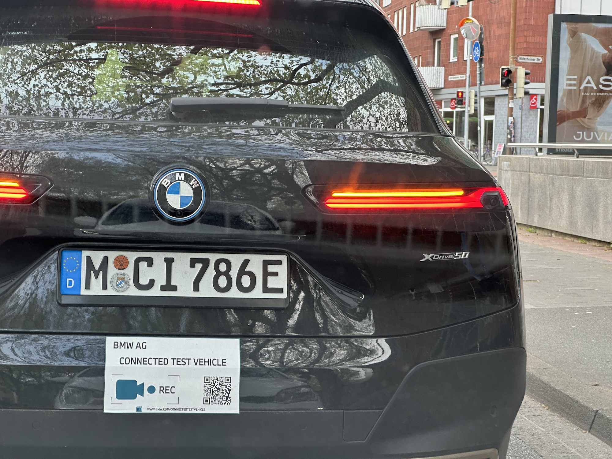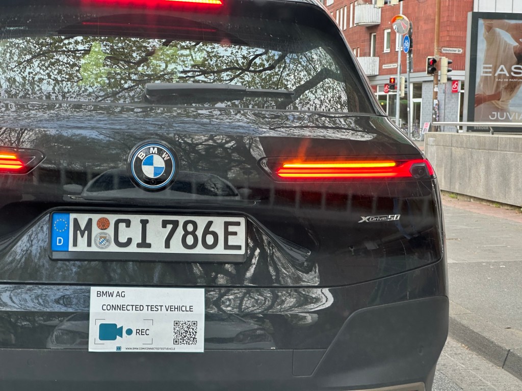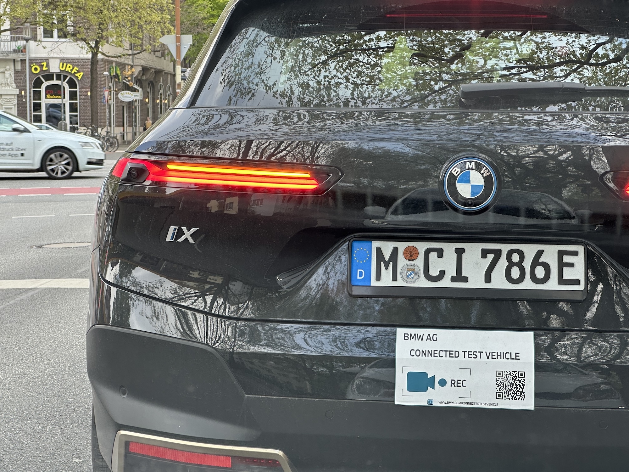 Nach den Mercedes-Benz-Fahrzeugen wurden noch weitere Testfahrzeuge von anderen Herstellern gesichtet. So sah Demokan in der Hannover Südstadt, beim Altenbekener Damm an der Ecke Hildesheimer Straße am 22. April 2024 dieses BMW Connected Testfahrzeug.