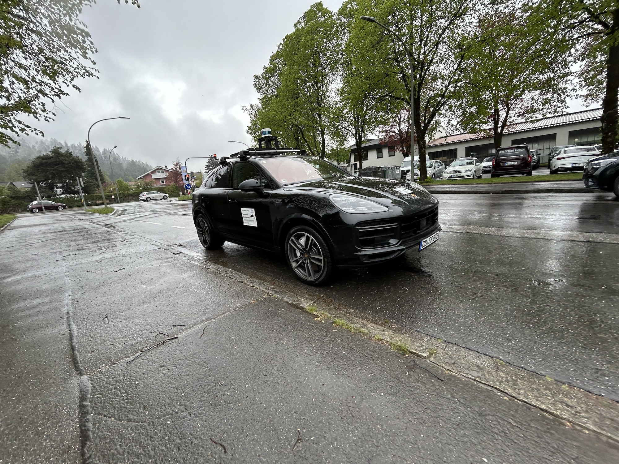 Dino Konrad wiederum sah diese beiden Porsche mit Lidar-Aufbauten. Der rote war am 22. April 2024 gegen 13.40 Uhr auf der A95 Richtung München Nähe der Ausfahrt Wolfratshausen unterwegs. Der schwarze Porsche Cayenne war gegen 11.00 Uhr in Partenkirchen (am Ende der Garmischer Autobahn) unterwegs.