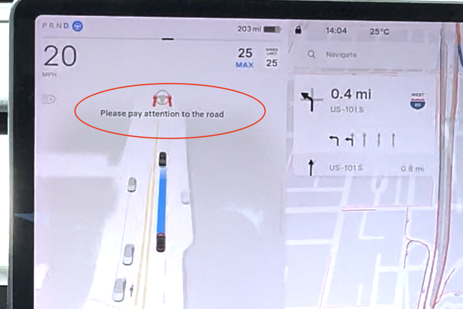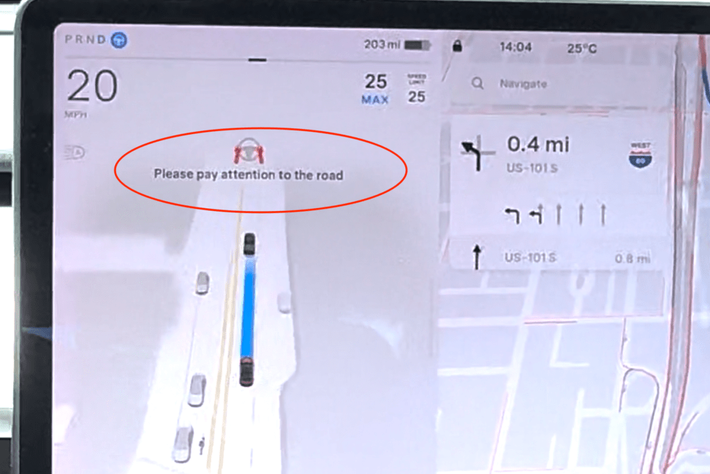Ich war auch überrascht, wie zügig die FSD die Autobahnauffahrt nahm. Auch erhöhe ich einmal im Video die maximale Geschwindigkeit von 25 Meilen pro Stunde auf 29 Meilen pro Stunde, damit ich nicht ein rollendes Hindernis blieb. Wohlgemerkt: die Geschwindigkeitsbegrenzung lag bei 25 Meilen pro Stunde (40 km/h).