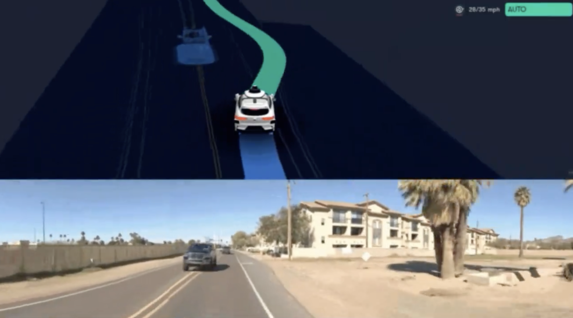 Nicht nur weicht das Waymo souverän und unverzüglich aus und fährt dabei auf den unbefestigten Straßenrand, es blinkt dabei auch noch!