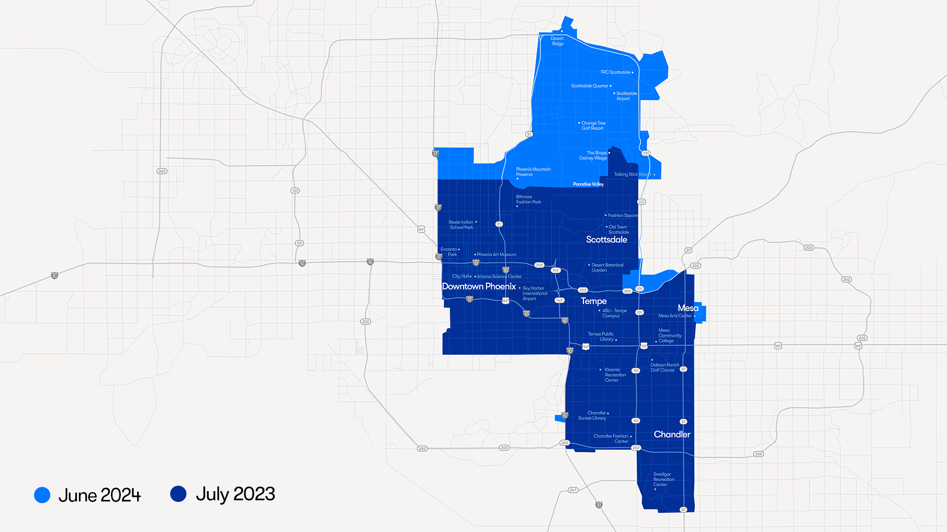 Und Waymo, das bereits in der San Francisco Bay Area, in Los Angeles, Phoenix und Austin kommerziell unterwegs ist, hat seinen Betriebsbereich in Phoenix seit Juni 2024 massiv ausgeweitet. Insgesamt bedient die Robotaxiflotte in der Stadt in Arizona eine Fläche von 315 Quadratmeilen (816 Quadratkilometer). Zum Vergleich: Stuttgart hat 80 Quadratmeilen (207 Quadratkilometer), München 120 Quadratmeilen (311 Quadratkilometer), Wien 160 Quadratmeilen (415 Quadratkilometer), Hamburg 292 Quadratmeilen (755 Quadratkilometer) und Berlin 344 Quadratmeilen (892 Quadratkilometer).