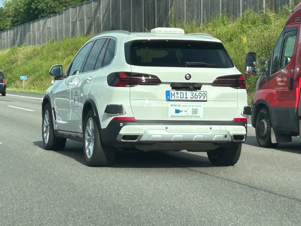 Dieses Testfahrzeug von BMW wurde von Dino Konrad auf der Autobahn A8 bei Augsburg, Fahrtrichtung Stuttgart gesichtet. Vorne befanden sich vier Sensoren, aber kein LIDAR am im vorderen Dachbereich.
