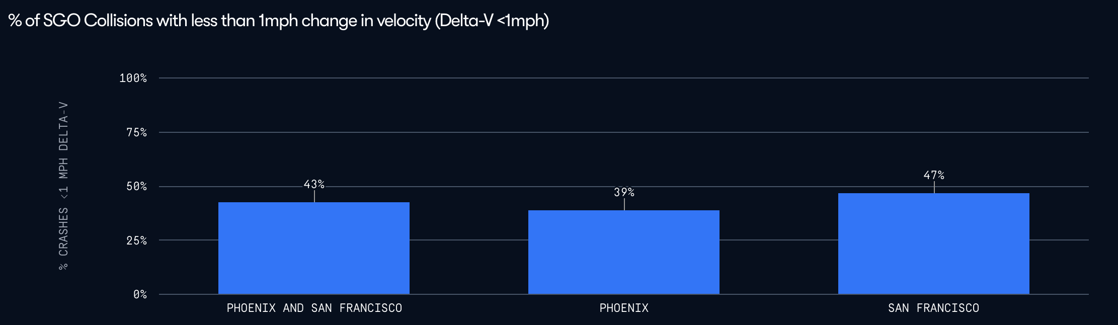 Selbst die Unfälle die mit Waymo-Beteiligung passierten, geschahen bei sehr geringen Geschwindigkeiten. So lag bei 43 Prozent der Unfälle in Phönix und San Francisco das Delta-V, also die gemessene Geschwindigkeitsänderung bei einer Kollision bei unter 1 Meile pro Stunde (weniger als 1,6 Kilometer pro Stunde), die üblicherweise nur zu kleinen Dellen oder Kratzern führen, wie sie beispielsweise bei Parkschäden zustande kommen.
