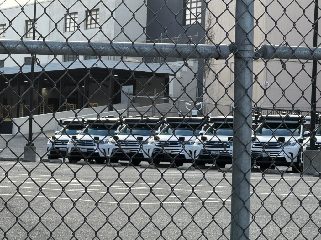 Dies ist das äußere Zoox-Depot in der Bryant Street, Ecke Division Street in San Francisco. Auf der Division Street befindet sich das Innere des Depots. Zu sehen sind 13 Testfahrzeuge der neuesten Generation und zwei der alten (schwarzen) Modelle. Ein Fahrzeug hat diese Wikingerhörner, wie ich sie vor ein paar Monaten gesehen habe.