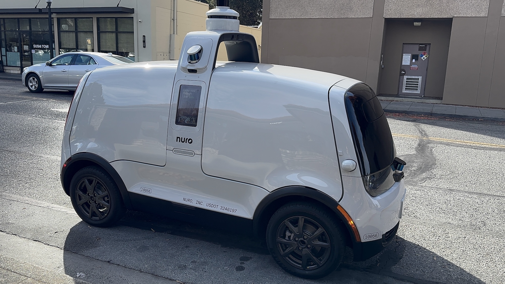 Dieser Nuro R3 Lieferroboter wurde in Mountain View auf der West Dana Street zwischen Hope und View Street am Dienstag, 19. November 2024 um 10:30 Uhr PDT gesichtet.