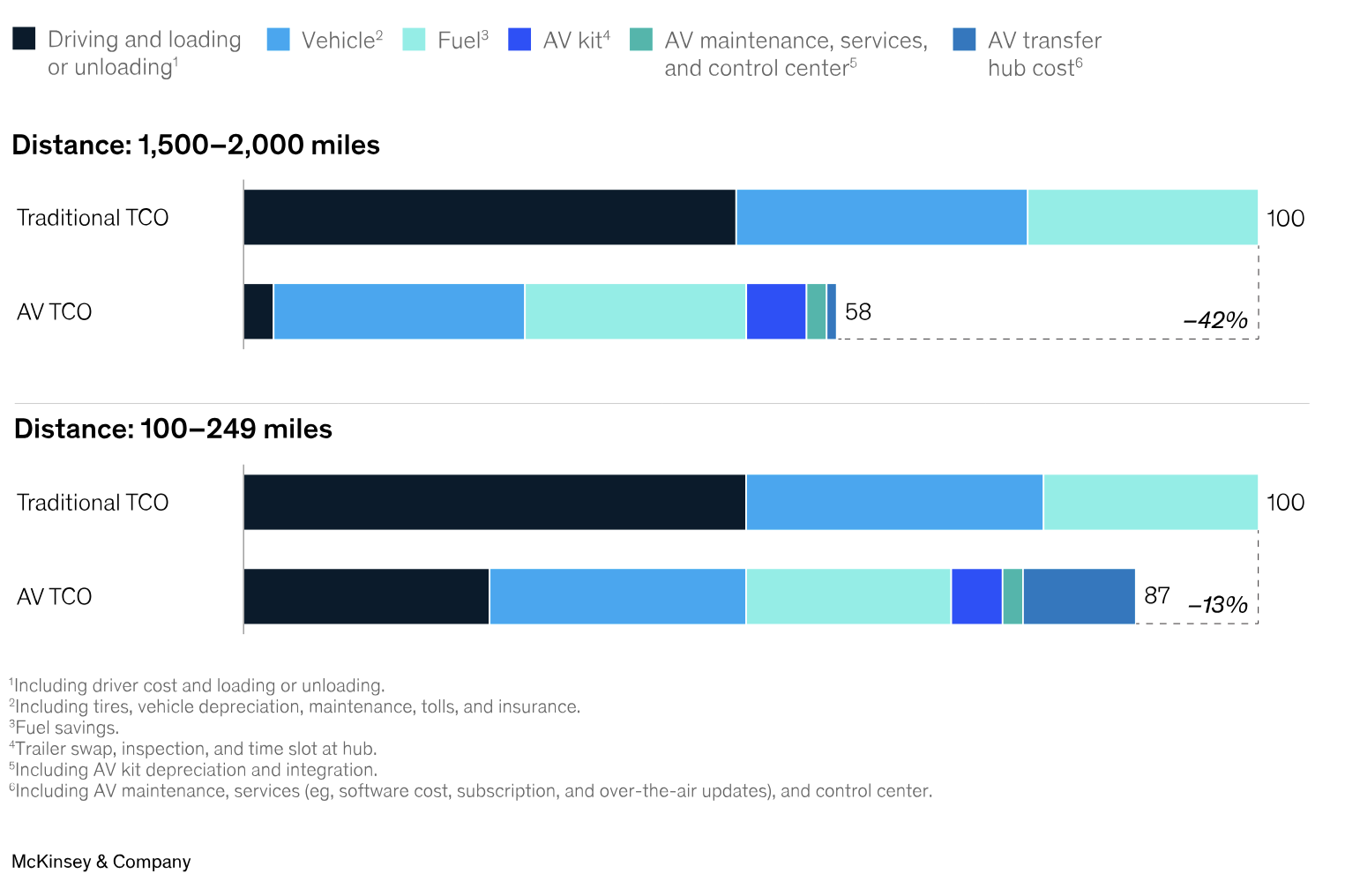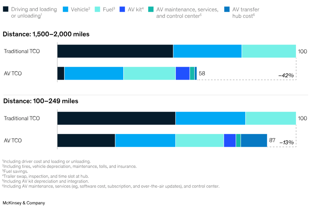 Nicht nur der Fahrermangel könnte durch autonome LKWs entschärft werden, sondern auch die von Fahrern verursachten Kosten verringert werden. Das zeigt eine neue Studie von McKinsey, die dabei die gefahrenen Strecken betrachtet. Speziell bei Distanzen von 1.500 bis 2.000 Meilen (2.400 bis 3.200 Kilometer) sind Einsparungen von bis zu 42 Prozent möglich. Bei kurzen Strecken zwschen 100 und 249 Meilen (160 bis 400 Kilometer) betragen die Einsparungen 13 Prozent.