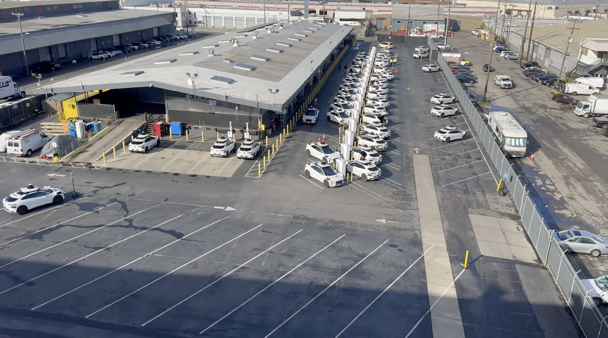Das Waymo-Depot in San Francisco gefilmt am 12.12.2024 gegen 11:10 Uhr mit 59 Fahrzeugen, von denen etwa 30 geladen werden.