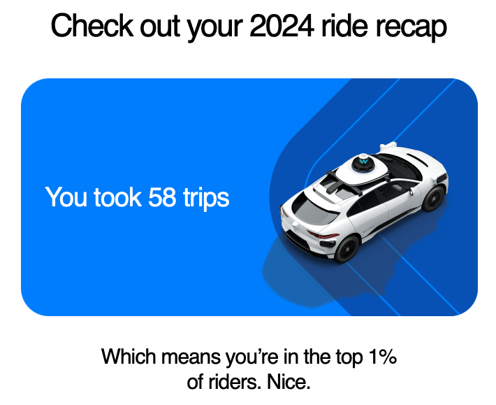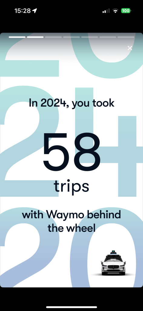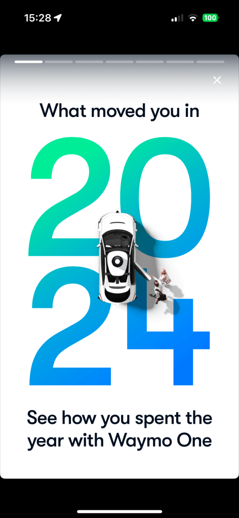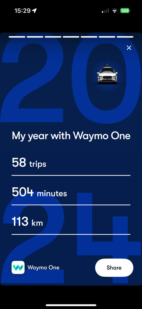 Eine E-Mail trudelte heute in mein Postfach und sie kam von Waymo. Mitsamt einer Aufschlüsselung meiner Fahrten im heurigen Jahr. Insgesamt unternahmen Waymos im Jahr 2024 mehr als vier Millionen Fahrten, und das vollständig fahrerlos. Sie fuhren über elf Millionen Stunden und sparten damit über 6 Millionen Kilogram CO2. Im November erreichte Waymo die Höchstzahl and wöchentlichen fahrt, die sich seither auf 150.000 belaufen. Insgesamt bedient Waymo in vier Metropolregionen in den USA eine Fläche von 500 Quadratmeilen (1.295 Quadratkilometer).