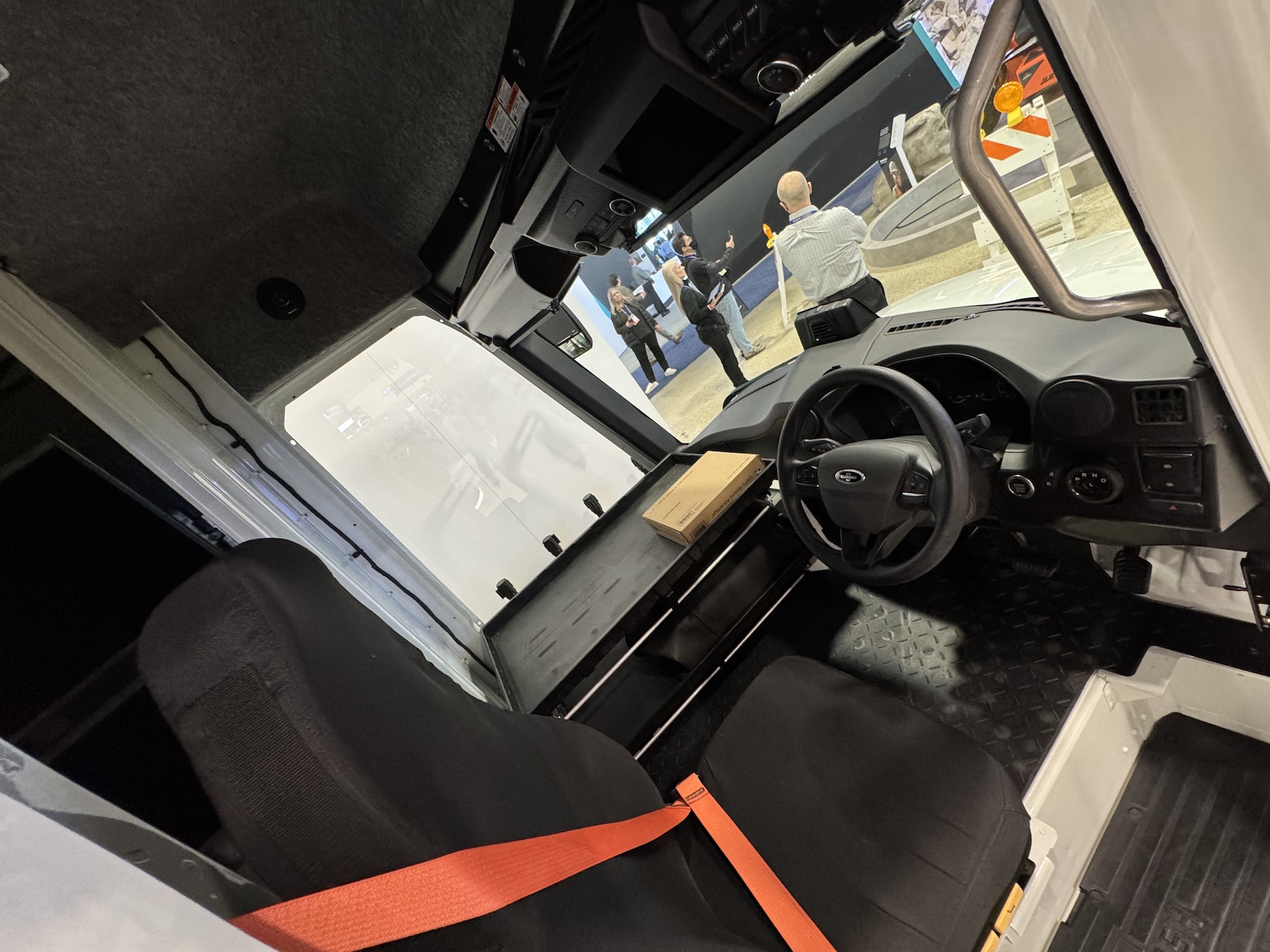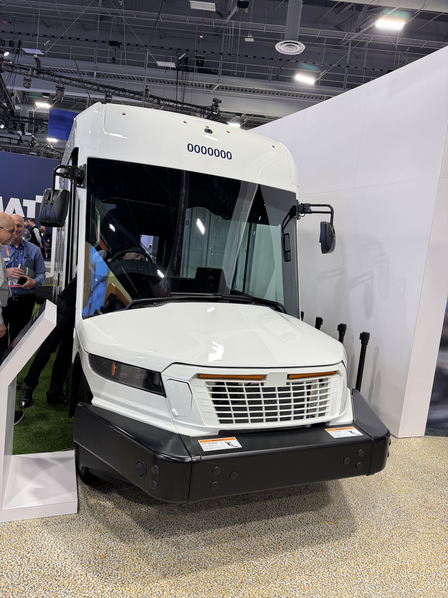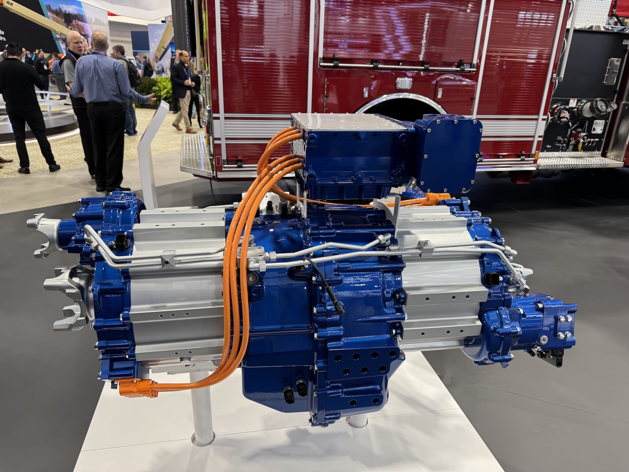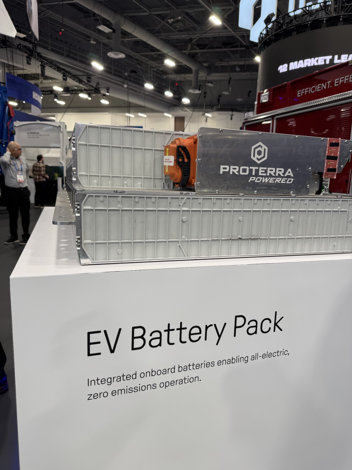 Die für die Elektrifizierung notwendigen Komponenten, wie ein Getriebe – das es üblicherweise bei Elektroauto-PKWs nicht gibt – und die Batteriepacks von Proterra waren auch ausgestellt.