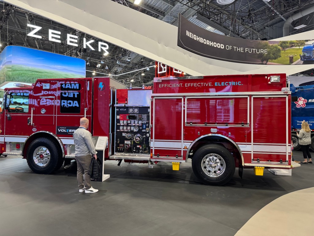 Neben diesen eher kleineren Fahrzeugen hatte Oshkosh auch zwei Schwerarbeiter im Einsatz. Das erste ist ein Feuerwehrfahrzeug im typisch amerikanischen Stil mit viel Chrom und Lack und rustikalem Aussehen.
