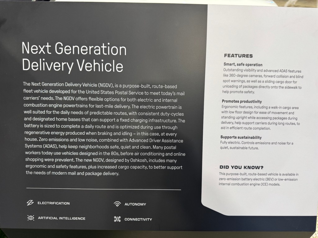 Auch die amerikanische Post stellt ihre hunderttausenden kleinen Lieferwagen von Verbrennungsmotoren auf elektrischen Antrieb aus. Attraktiv sieht das nun mehr entenförmige Fahrzeug zwar nicht mehr aus, nur wird damit wohl auch niemand auf die Ideen kommen, es zu stehlen und sich damit sehen zu lassen – mit Ausnahme der Postler. Man beachte auch, dass das Lenkrad auf der rechten Seite des Fahrzeugs ist, weil beim Postaustragen immer wieder rechts am Gehsteig angehalten und der Briefkasten beladen wird.