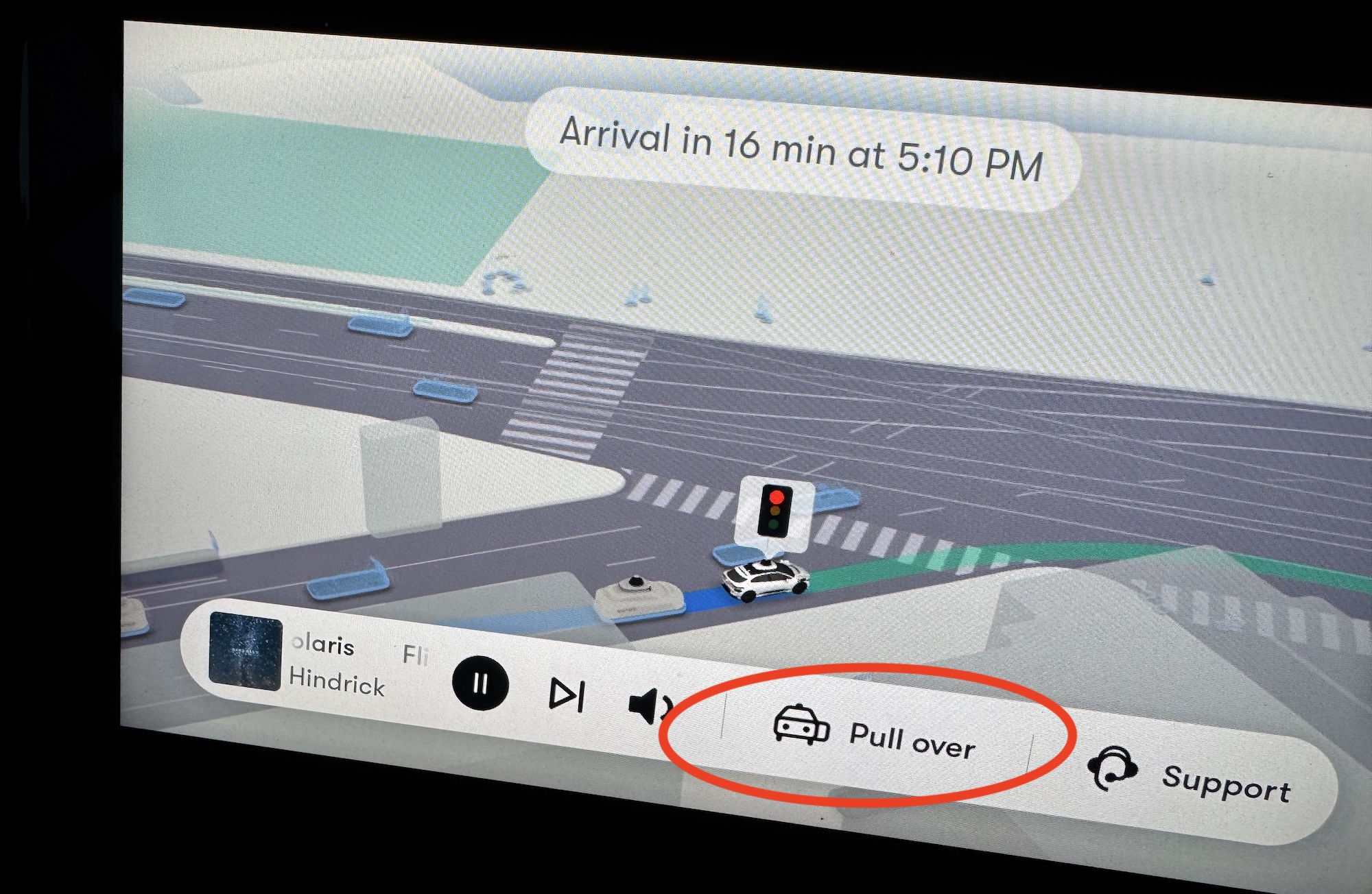 Doch Passagiere haben noch weitere Möglichkeiten, um eine Fahrt vorzeitig zu beenden, und die Funktion kann sehr leicht gefunden werden. Auf beiden Bildschirmen – auf dem Vordersitz und auf der Rückbank – ist deutlich „Pull Over“, also „Fahr heran“ sichtbar. Mit dieser Funktion fährt das Waymo sicher an den Straßenrand, hält an, und lässt die Passagier aussteigen. Die Fahrt ist beenden und die Passagiere sind ausgestiegen.
