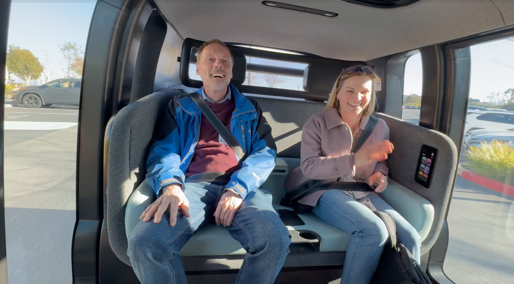 Zwei Fahrzeuge fahren aktuell zwischen zwei Zoox-Bürogebäuden in Foster City als Shuttle, wobei in der dreiminütigen Fahrt knapp 0,9 Meilen (1,5 Kilometer) zurückgelegt werden. Das Fahrzeug fühlte sich angenehm geräumig an, trotzdem wir zu viert drinnen saßen und fuhr auch zügig ohne viel zu zögern die Strecke. Spitzengeschwindigkeit ist zwar 75 Meilen pro Stunde (120 km/h), doch da das Fahrzeug vor allem im Stadt- oder Industriegebiet eingesetzt wird, fährt es zumeist maximal 35 bis 45 Meilen pro Stunden (56 bis 72 km/h). Im Fahrzeug gibt es – wie im Video zu sehen – links und rechts von jeder der beiden Sitzbänke einen kleinen Touchscreen, von dem aus die Fahrt gestartet werden kann. Auch Musik und Türen können damit bedient werden. DWie im Video zu sehen ist, befindet sich links und rechts von jedem der beiden Sitze im Fahrzeug ein kleiner Touchscreen, von dem aus die Fahrt gestartet werden kann. Außerdem lassen sich damit die Musik und die Türen steuern. Es wird auch eine App geben, die derzeit nur für Zoox-Mitarbeiter zugänglich ist.