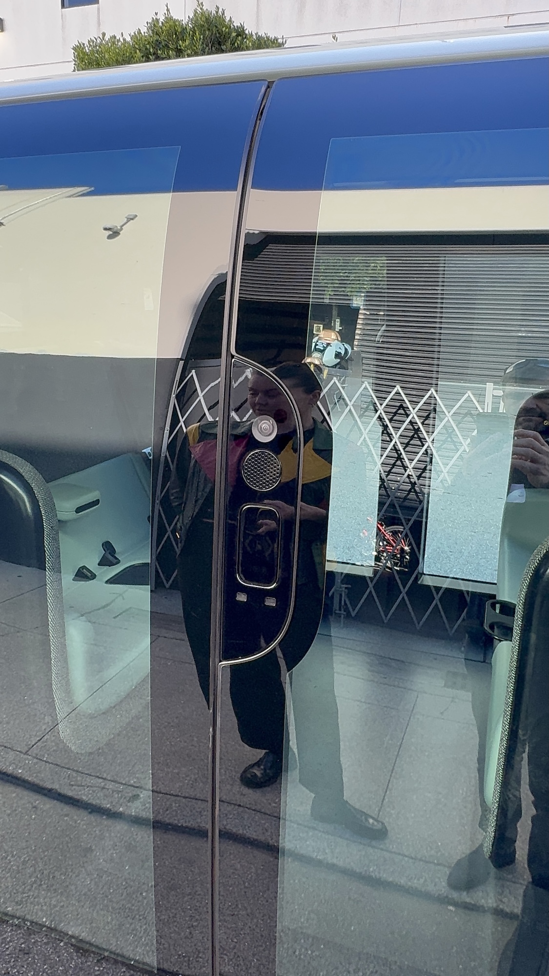 Am Fahrzeug selbst sind auf den Seitenpaneelen Mikrophone eingebaut, wie im Video zu sehen ist. Damit können Geräusche wie Sirenen von Einsatzfahrzeugen erfasst und entsprechend darauf reagiert werden. In den USA beispielsweise müssen die andere Verkehrsteilnehmer an den Straßenrand fahren, wenn sich Einsatzfahrzeuge im Einsatz von hinten nähern und auch, wenn sie aus der Gegenrichtung kommen und es keine physische Barriere zwischen den Fahrspuren gibt. Auch in den Schiebetüren sind Mikrophone und Kameras eingebaut, wie im Foto zu erkennen.