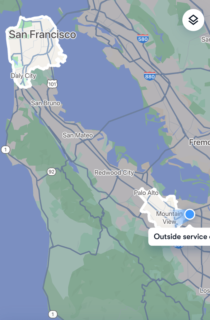 Das nunmehr genehmigte Betriebsgebiet umfasst die gesamte San Francisco Bay Area von San Francisco im Norden bis San José im Süden, und von Milpitas im Osten bis zur Skyline HWY 85 im Westen (siehe Abbildung).