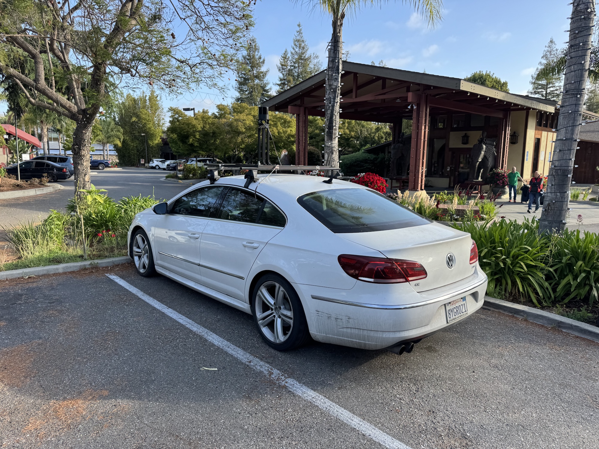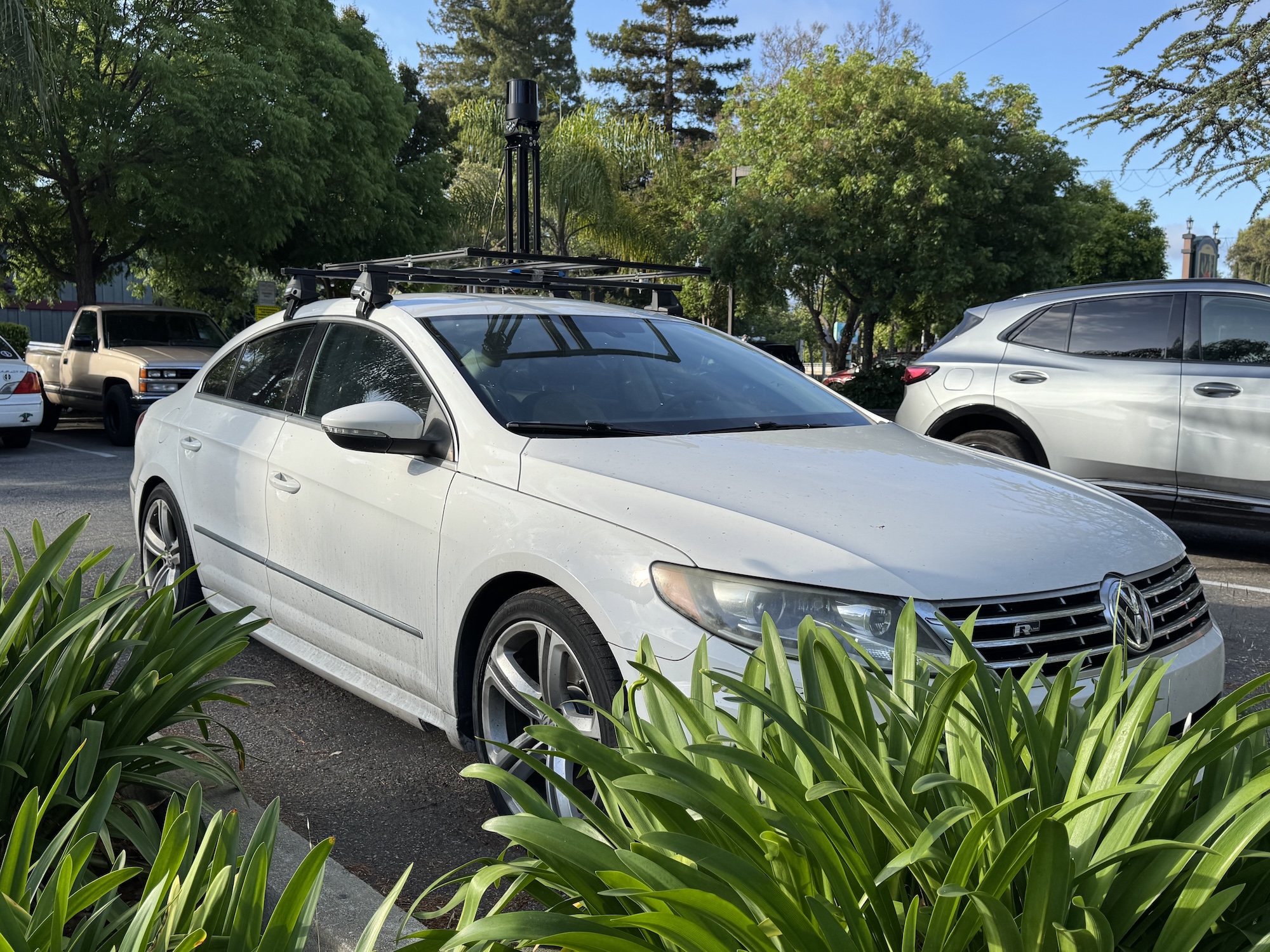 Dieser unidentifizierte Volkswagen mit einem Lidaraufbau wurde am Samstag, dem 24. Mai 2025 gegen 7:45 PDT auf dem Parkplatz des Hotels Dinah’s Garden in Palo Alto gesichtet.