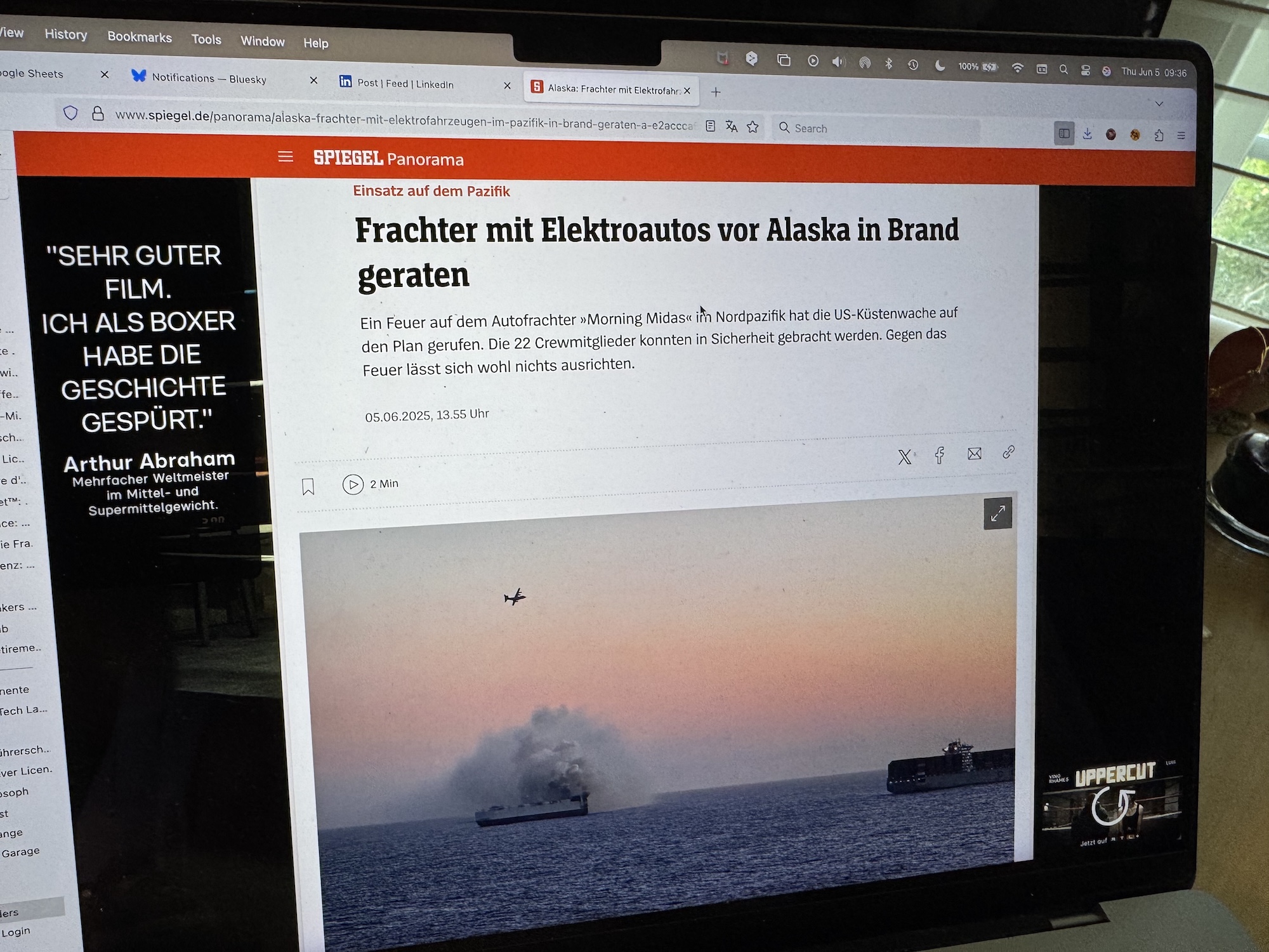 Das Autofrachtschiff Morning Midas hat in der Nähe von Alaska Feuer gefangen und die 22-köpfige Crew konnte nach Löschversuchen nicht viel erwirken und musste das Schiff verlassen. Die Fracht an Bord umfasst 3.000 Autos, davon 2.249 Verbrennungskraftfahrzeuge, 681 Hybridfahrzeuge und 70 (in Worten: siebzig) Elektroautos.