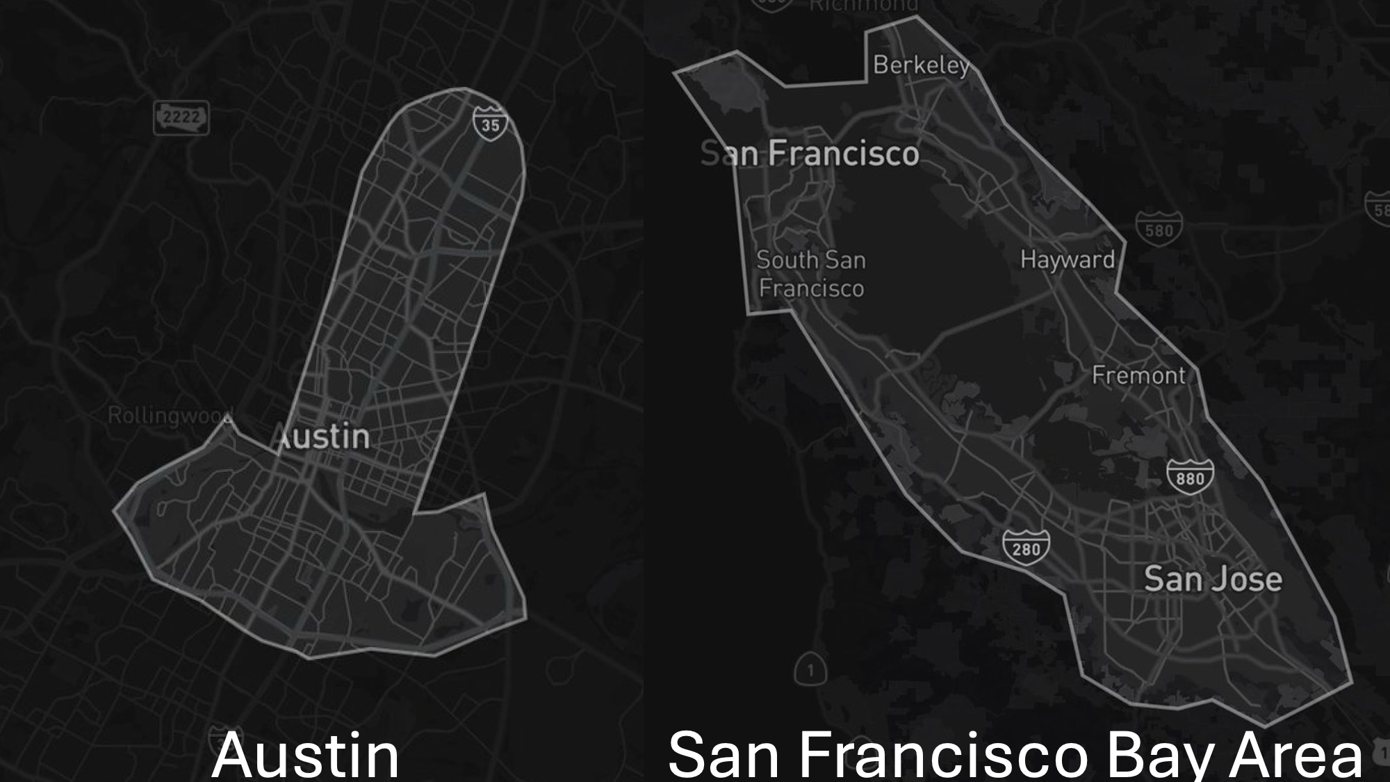 Mit dieser App können Teslas mit einem Fahrer bestellt werden. Der abgedeckte Einzugsbereich reicht von San Francisco im Nordwesten und Berkeley im Nordosten bis hinunter nach San José und stellt mit viel Fantasie das weibliche Gegenstück zum nach dem männlichen Sexualorgan aussehenden Testgebiet in Austin dar.