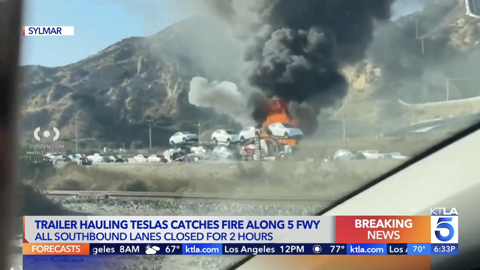 Der Grund für die Vollsperrung war, wie ich aus dem zwischen den Bergen aufsteigenden Rauch vermuten konnte, wohl ein Fahrzeugbrand oder Buschbrände. Und tatsächlich, es war ein Fahrzeugbrand, der Elektroautos involvierte. Nur nicht so, wie manche aus Schadenfreude meinen würden. Denn nicht die 7 Teslas, die auf dem Autotransporter standen, waren in Feuer ausgebrochen, sondern die Diesel-Zugmaschine. Und das Feuer griff leider rasch auch auf die Teslas über von denen zumindest vier vom brennenden Diese-LKW zerstört wurden.