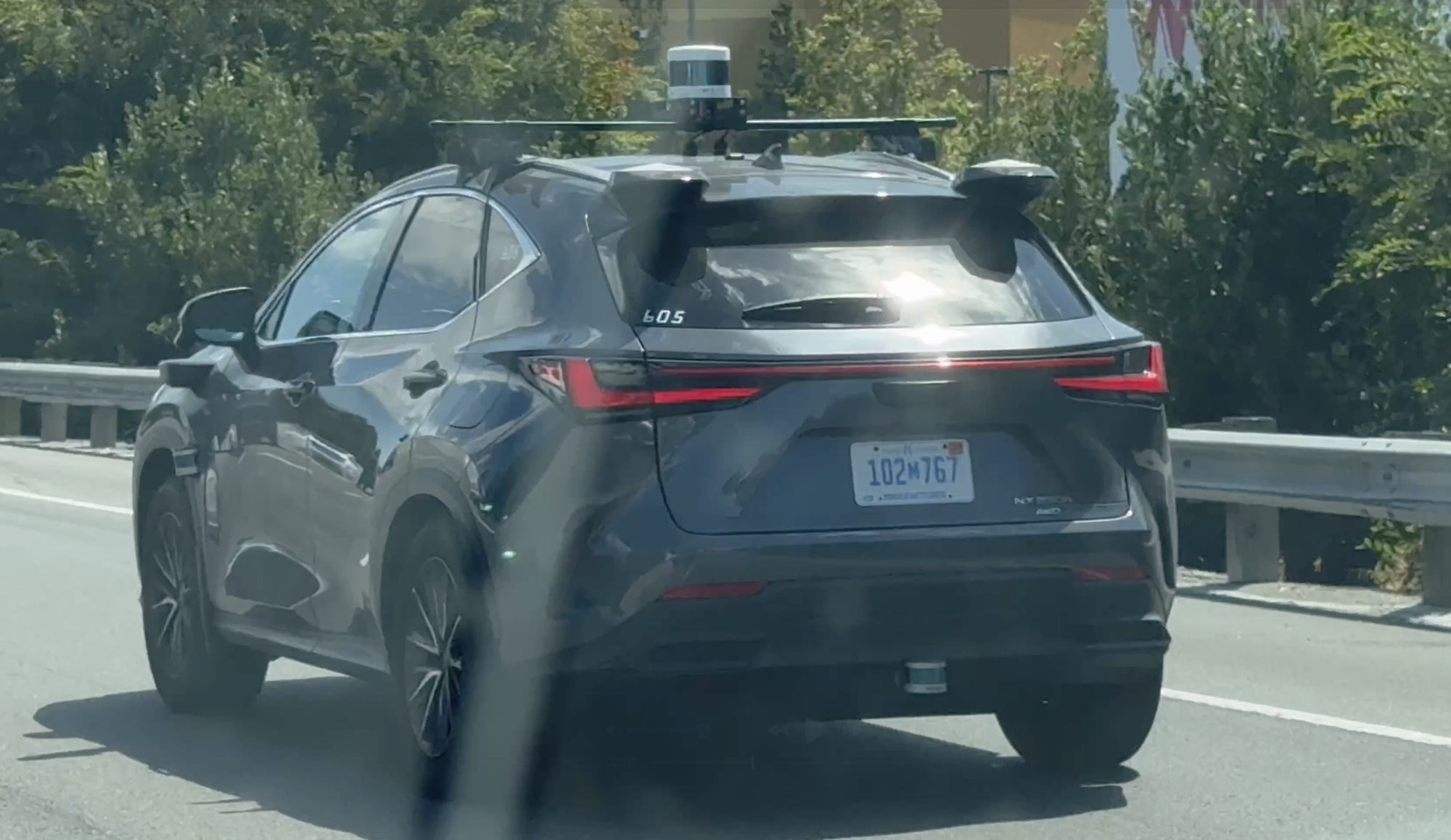 Dieser nicht identifizierte Lexus mit Sensorhalterungen und einem Hersteller-Kennzeichen aus Michigan wurde am 25. August 2025 gegen 13:39 Uhr PDT auf dem Highway 101 in der Nähe von Rengstorff gesichtet.