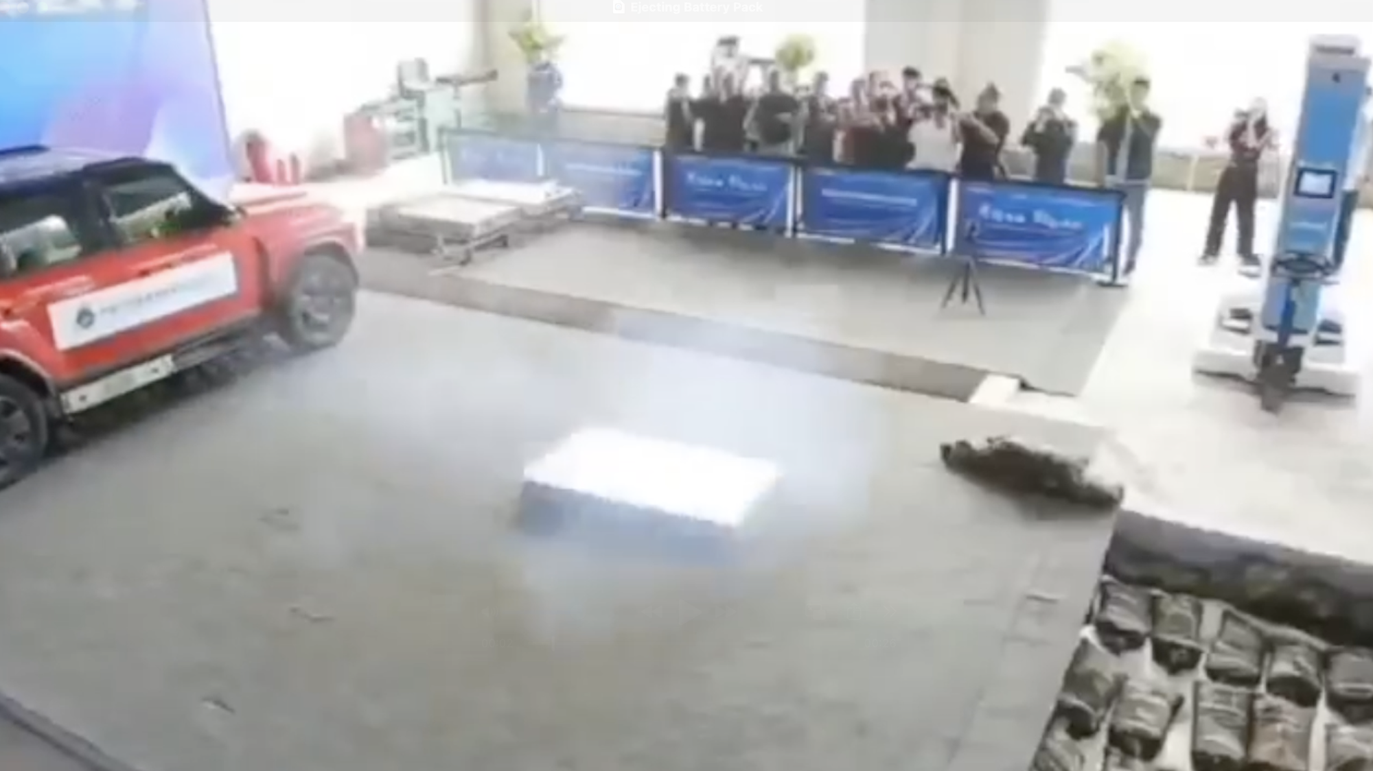 Trotzdem werden Lösungen gesucht, und eine solche wurde auf einer Veranstaltung in China prásentiert. Das Chinese Vehicle Collision Repair Technical and Research Center gemeinsam mit Joyson Electronics demonstrierten ein herausschleuderbares Batteriepack aus einem Chery iCar 03. Dabei wurde mittels Gasdruck ein Batteriepack etwa drei bis sechs Meter seitlich aus dem Fahrzeug unter lautem Krach geschleudert.