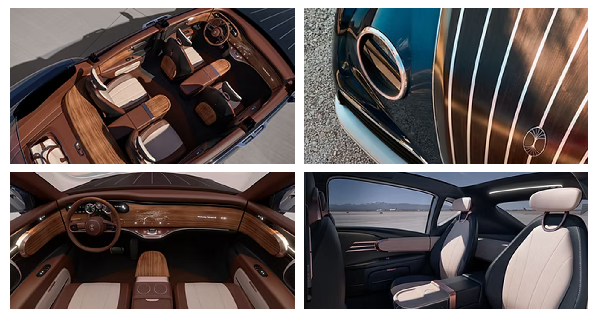 Einige Details des Fahrzeugs stechen heraus: So ist die Motorhaube aus Walnussholz oder einem Holz nach Wahl des Kunden handgefertigt. Das Armaturenbrett ist ebenso aus Massivholz, und weist Anzeiger mit Drehregler und umgebenden taktilen Tasten auf. Jeder Sitz des Fahrzeugs verfügt über spezielle Außenstauraumfächer, die auf individuelle Bedürfnisse zugeschnitten sind. Unter der markanten Motorhaube befindet sich ein geräumiges Fach, in dem beispielsweise ein kompletter Satz Skier Platz findet.