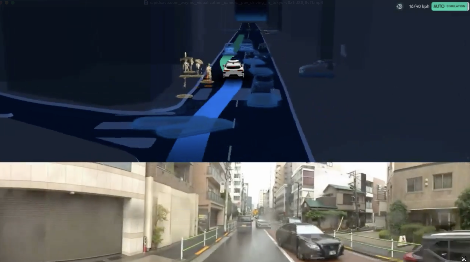 Der Waymo Driver zeigt gute Anzeichen für eine allgemeine Anwendbarkeit über die USA hinaus: Die Simulation (oben) der realen Fahrdaten (unten) sieht sehr vielversprechend aus und demonstriert Robustheit gegenüber Linksverkehr und anderen lokalen Besonderheiten.