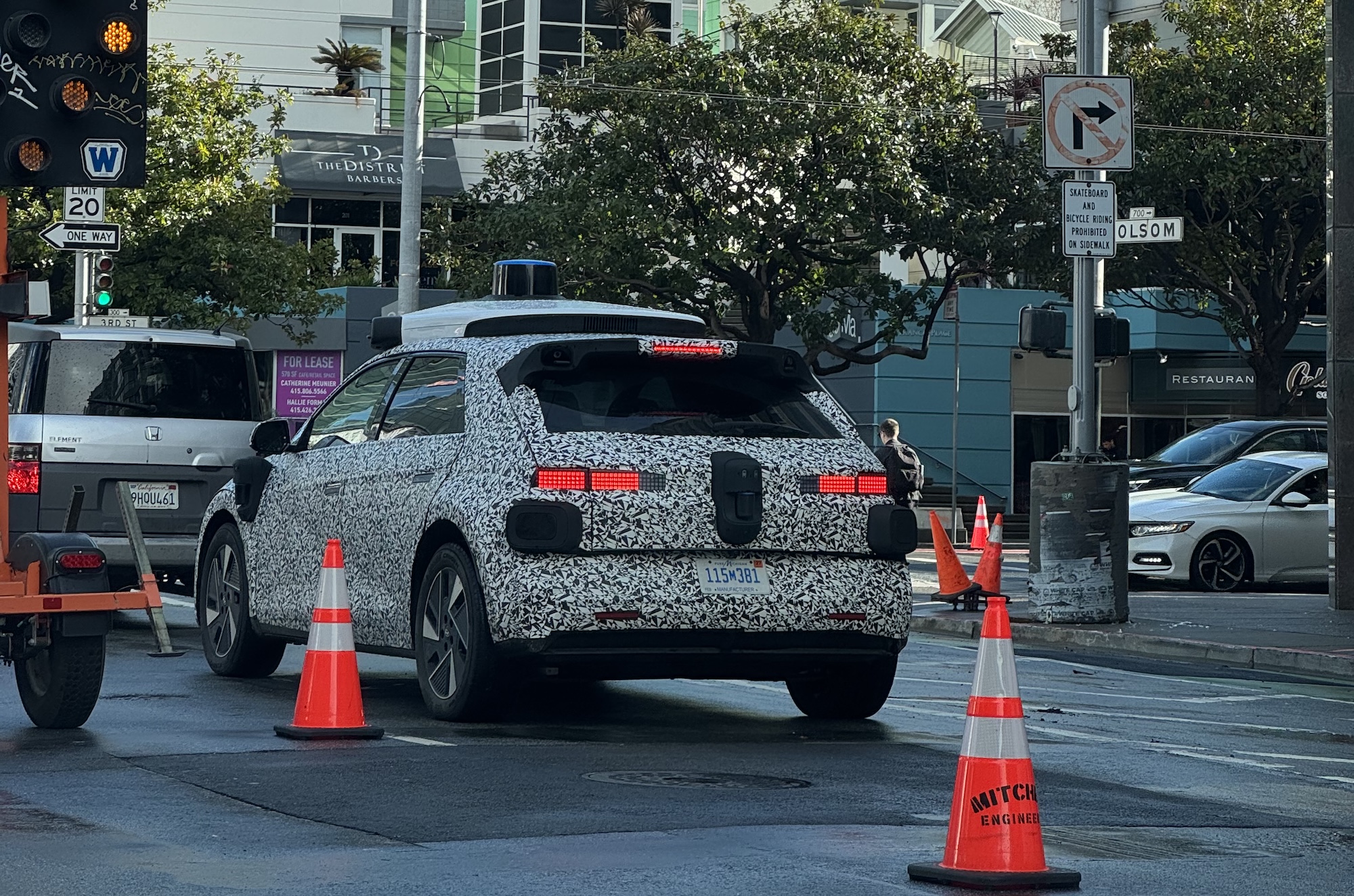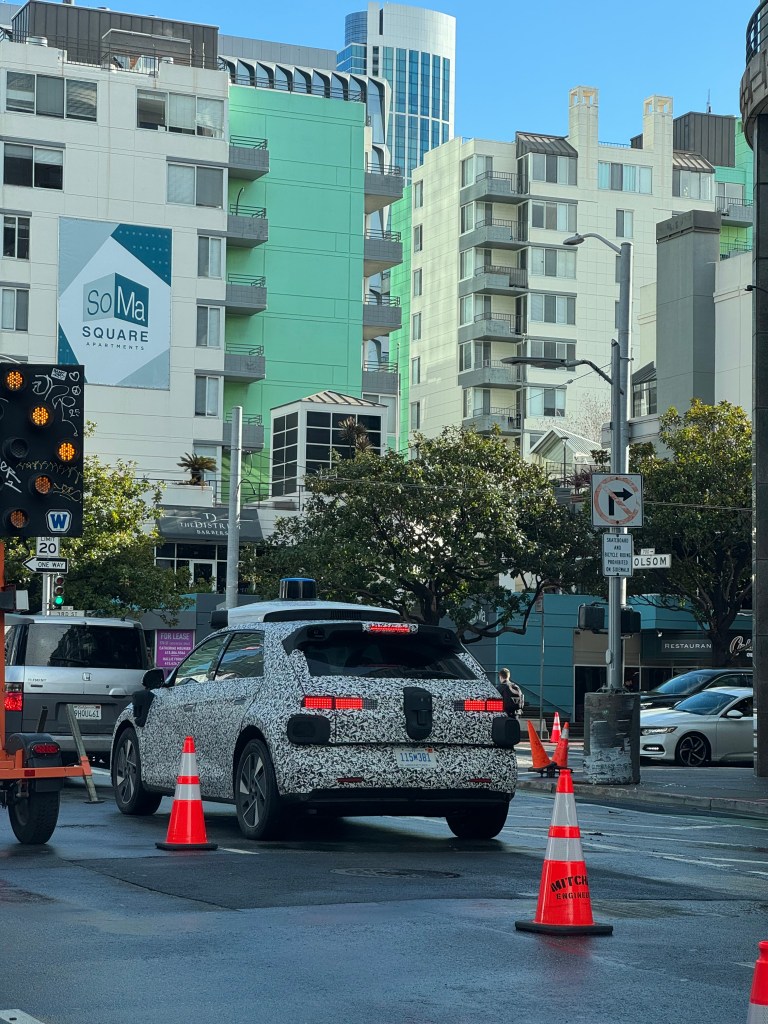 Dieser camouflierte Hyundai Ioniq 5 mit den Aufbauten des Waymo Driver 6. Generation wurde von einem anonymen Leser heute um 9:22 Uhr auf der 3rd Street und Folsom Street gesichtet.