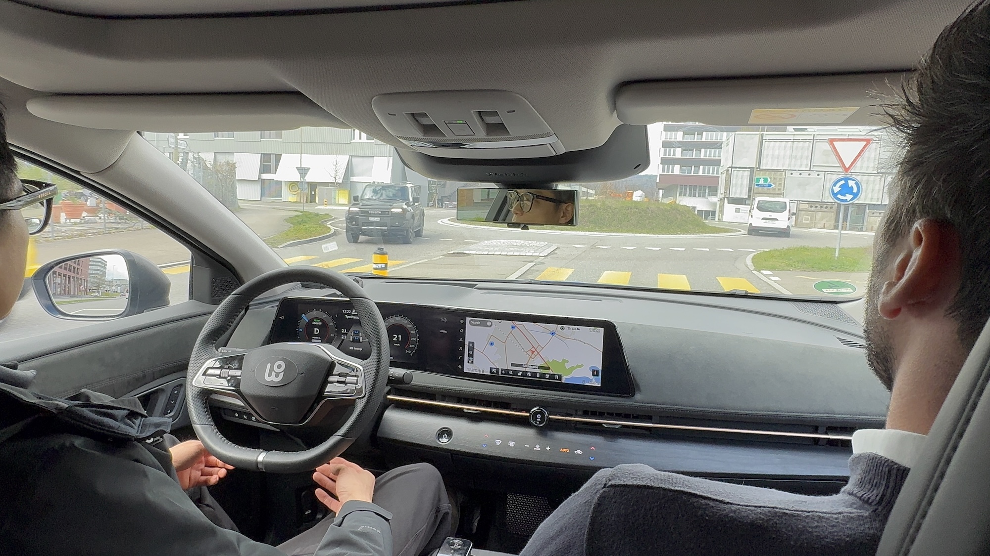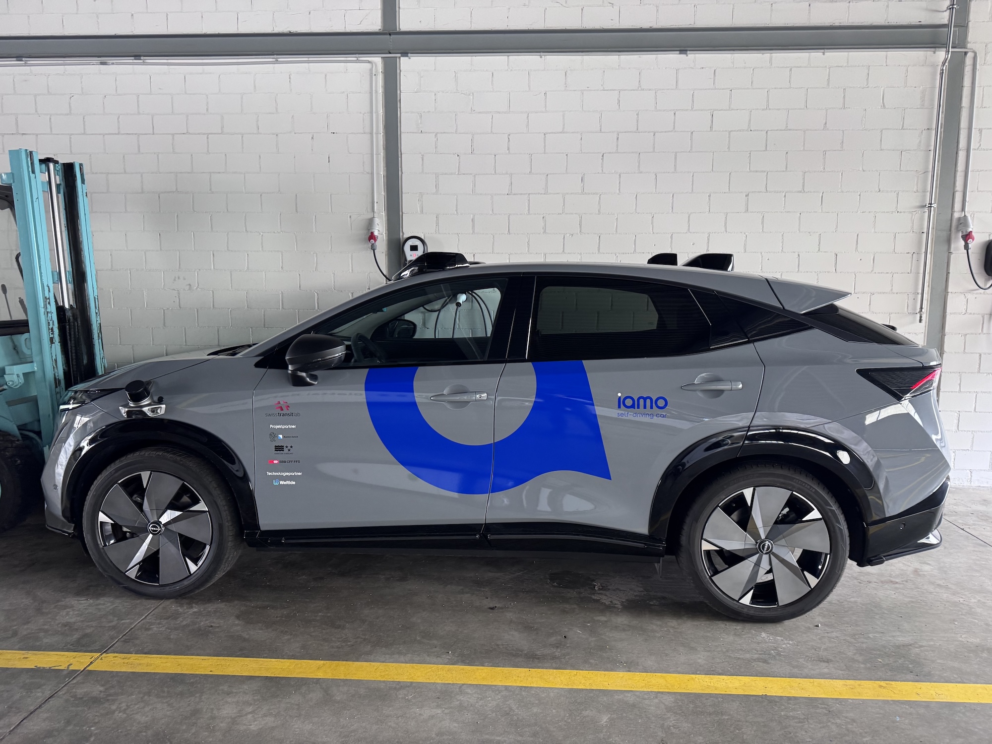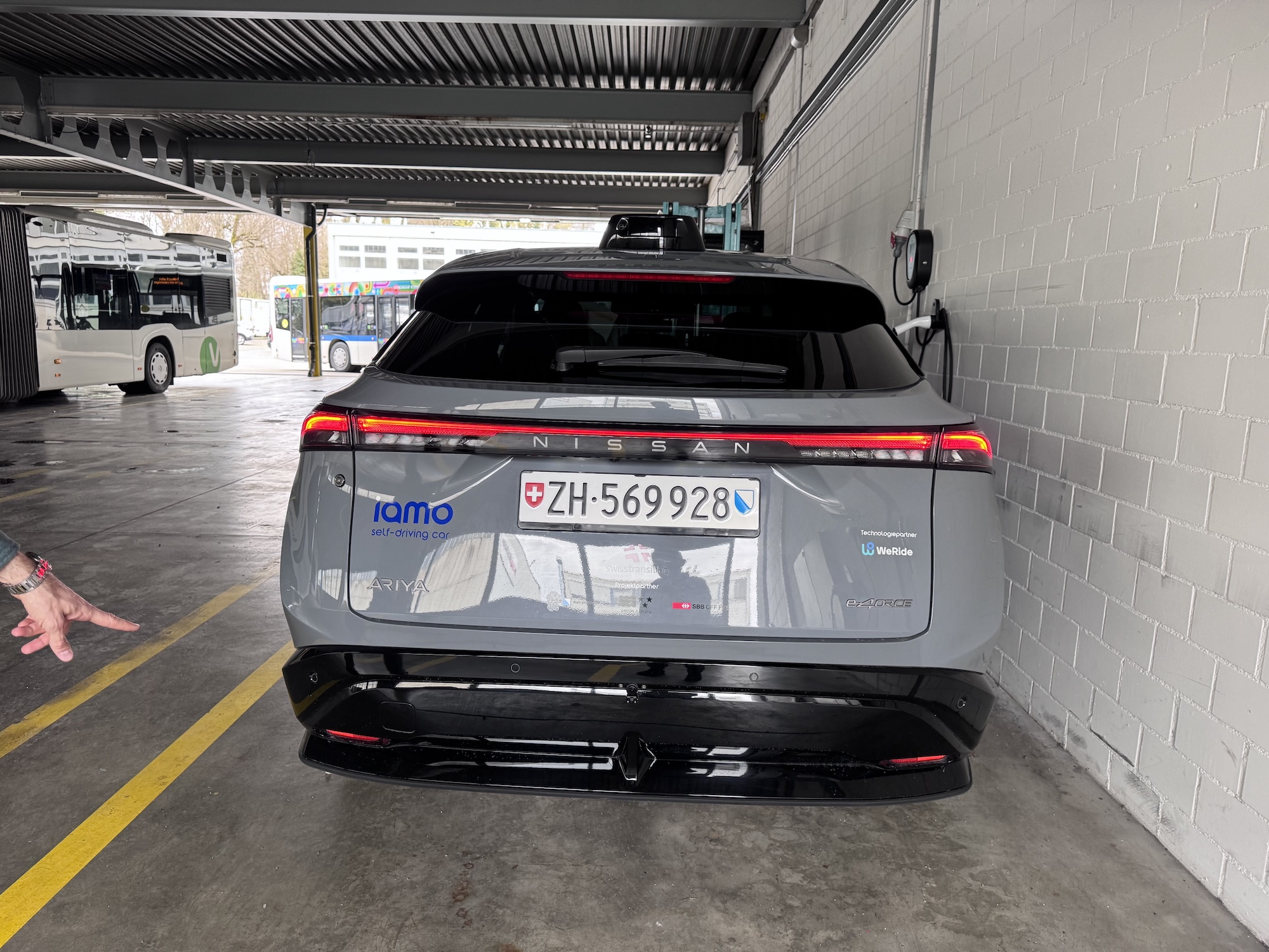 WeRide testet aktuell mit drei Fahrzeugen in der Schweiz, einem von mittlerweile 12 Ländern. Dabei hatte ich die Chance, mit einem Fahrzeug eine Runde im Testgebiet um Regensdorf-Watt, einem Vorort von Zürich, mitzufahren. Auf der Basis des Nissan Ariya sind 11 Kameras und 6 Lidars am Fahrzeug angebracht, sowie im Kofferraum die Recheneinheiten.